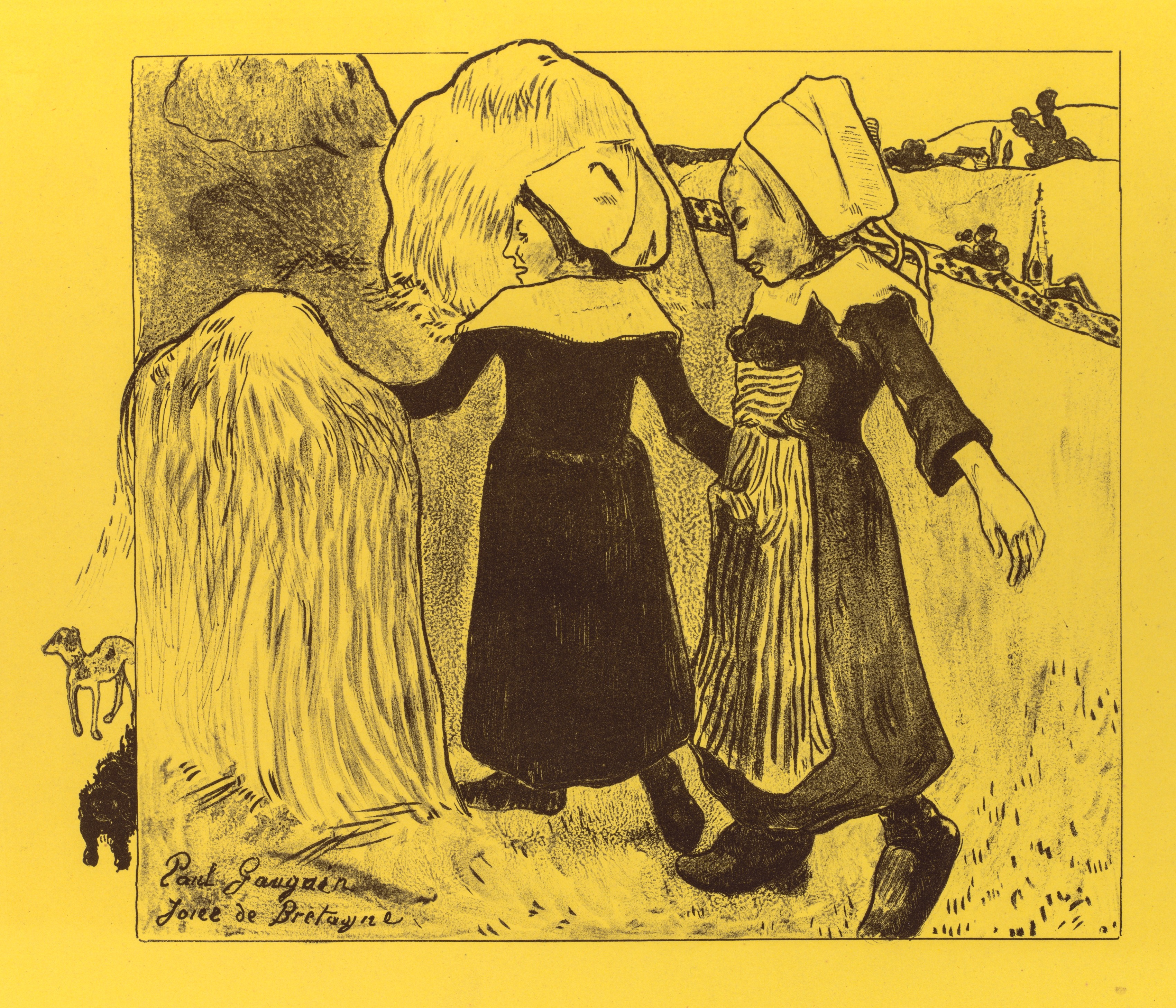 Yellow background with a black and yellow drawing of two women in traditional clothing walking. The woman on the left wears a dark dress, a white head covering and a white collar. She faces right. The woman on the right wears a dark dress, a white bonnet, and a light-colored apron. She faces left. A dog stands to the left. A landscape with a church steeple is in the background. The drawing is signed in the bottom-left corner. Text reads "Paul Gauguin" and "Joies de Bretagne".