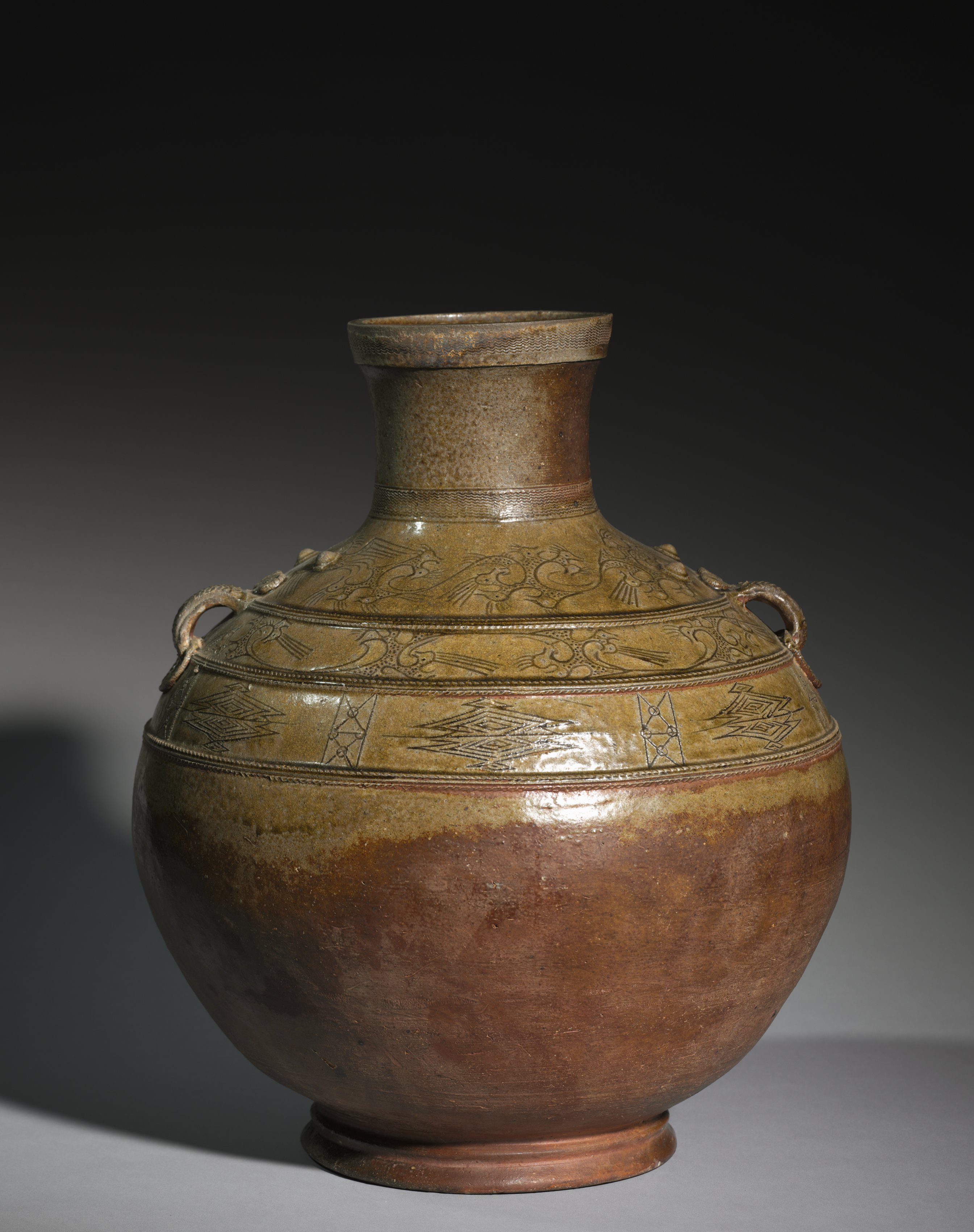 Brown ceramic jar with a narrow mouth and two handles on either side. The jar has a bulbous body with a wide shoulder and a narrow neck. The upper portion is glazed in shades of brown and tan, while the lower portion is a darker brown. The upper part of the jar features etched designs, including geometric patterns and animals. The background is dark gray, with a shadow cast to the left of the jar. The jar, titled "Jar (Hu)", is by an unspecified artist.