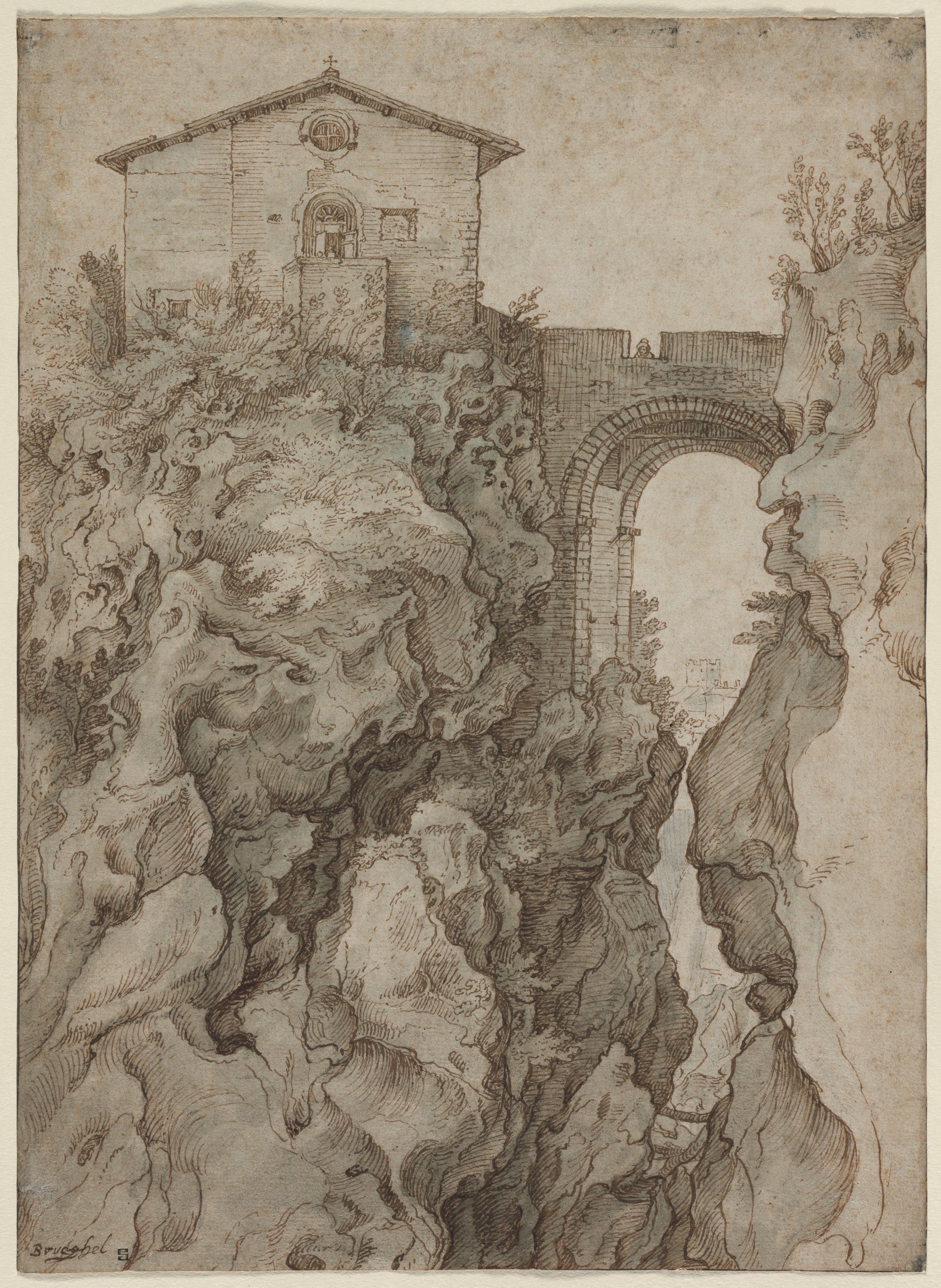 A building with a triangular roof featuring a circular window with a cross at the top sits atop a cliff on the left. The building has a large arched doorway on the first floor and a small rectangular window on the second floor. A stone bridge with an arch spans a deep gorge on the right. The gorge has steep cliffs with trees and bushes. The drawing is in shades of brown, with darker shading used to indicate depth and texture.