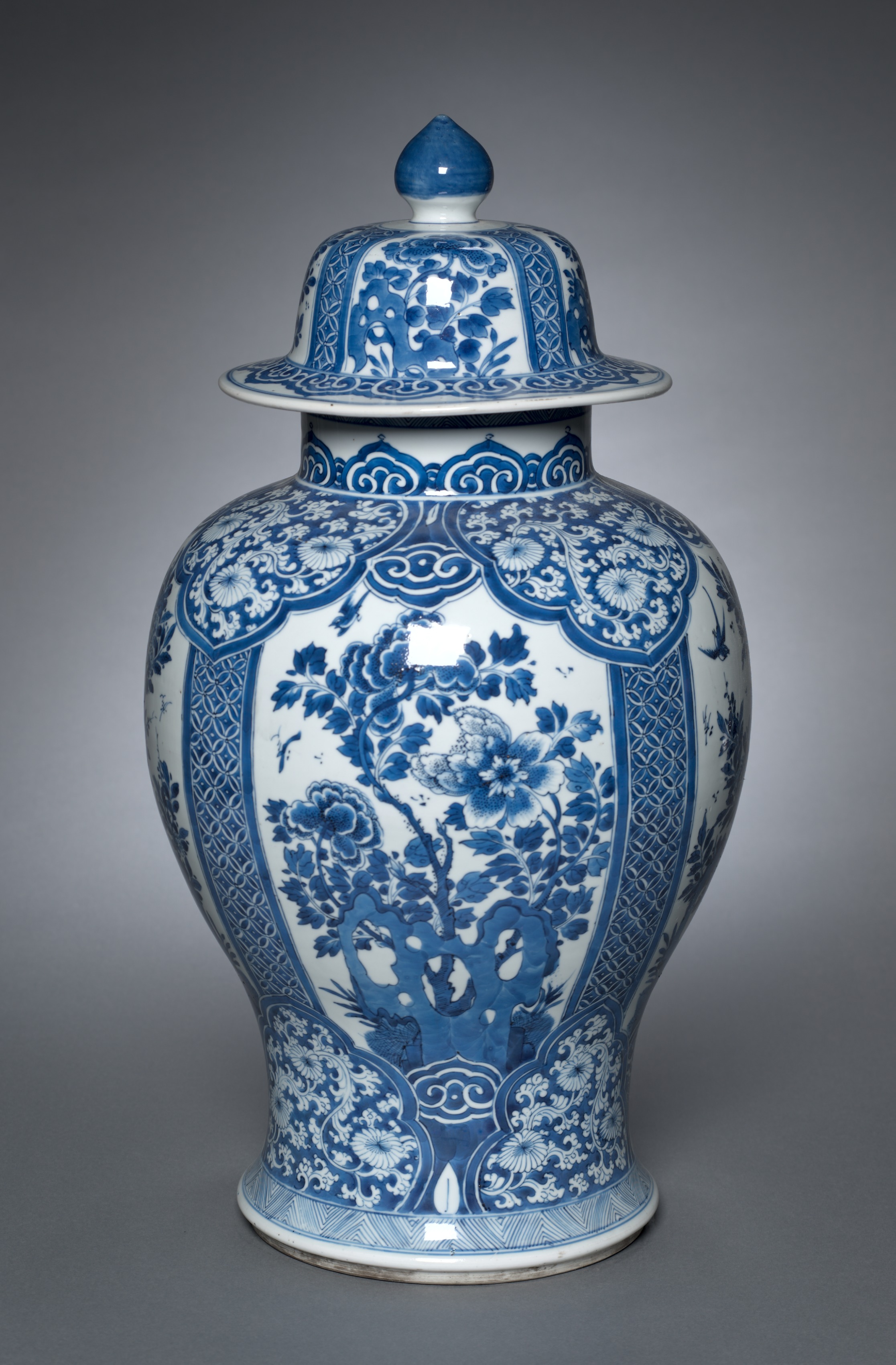 The Vase with Cover is white with blue floral designs. The vase has a wide mouth and a narrow base. The body of the vase is bulbous in the middle. The vase has a removable lid with a small finial on top. The vase and lid are decorated with intricate blue designs, including flowers, leaves, birds, and geometric patterns. The designs are painted in varying shades of blue. The background of the vase is white. The vase appears to be made of ceramic or porcelain. The overall shape of the vase is symmetrical. The lid sits on top of the vase. The finial on the lid is small and rounded. The designs on the vase and lid are similar. The background behind the vase is gray and darkens toward the edges.
