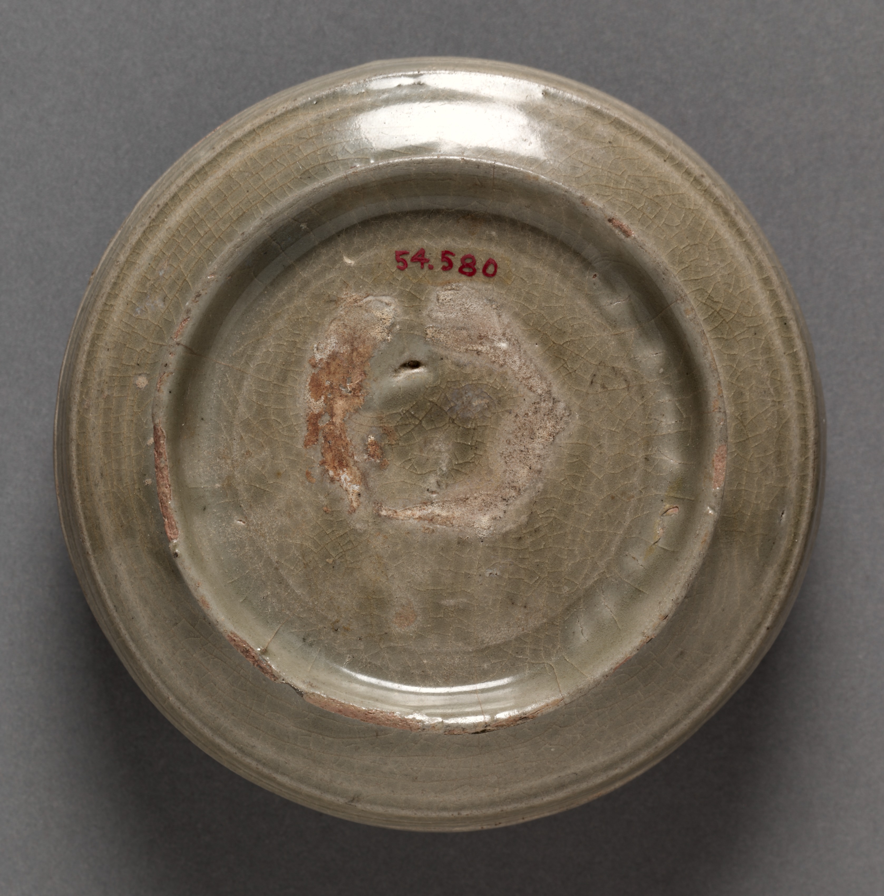 The Box: Yue ware. Gray ceramic object with a wide, rounded base and slightly raised lip. The surface features concentric circles with visible cracks in the glaze, with exposed terracotta-colored body in places. Red numbers are written on the base: 54.580. The background is a uniform dark gray color.