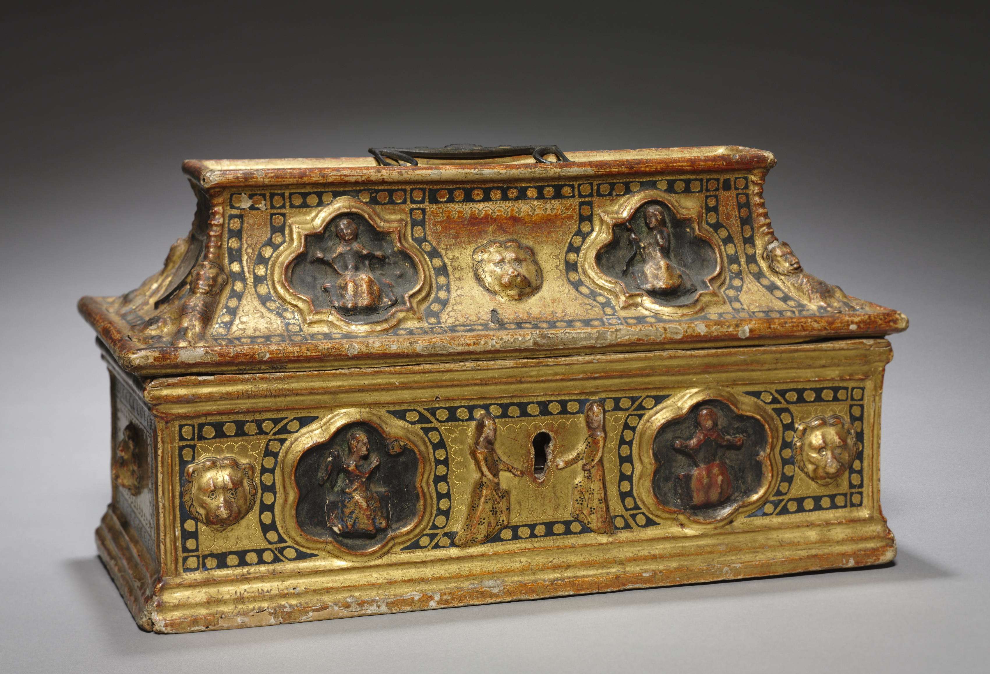 Gold-colored casket with black accents and various figures. The casket has a rectangular body and a sloping top. The top features three rounded square indentations with raised figures. From left to right, the figures are: a man with a long beard; a woman; and a woman with her hands out. The front of the casket has a keyhole and three rounded square indentations with raised figures. From left to right, the figures are: a woman; a man with a long object; and a woman with her hands out. The sides have a lion's head design. The background of the image is dark gray to light gray. The artist of the casket is not visually identifiable. The title of the casket is "Casket".
