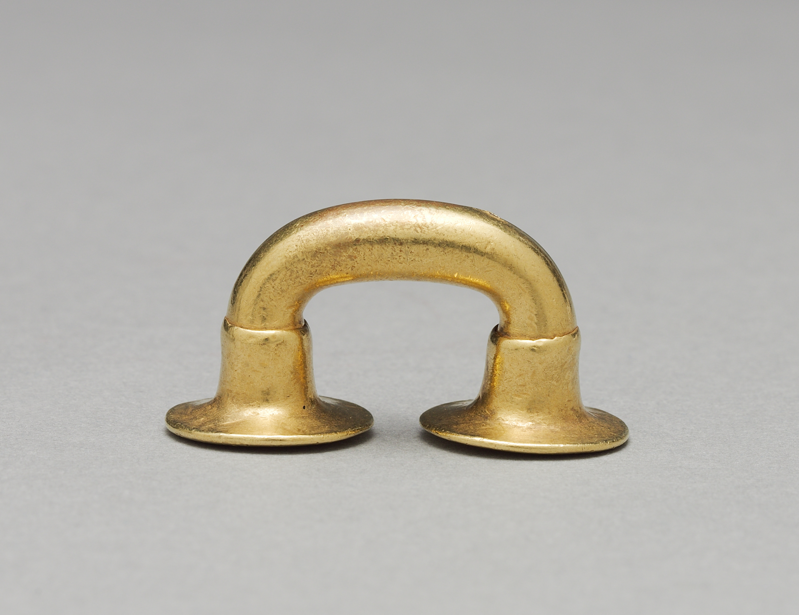 The nose ornament is gold-colored. The object has a U-shape. The two ends have flat circular bases. The bases are side by side. The object is made of metal. The background is gray.