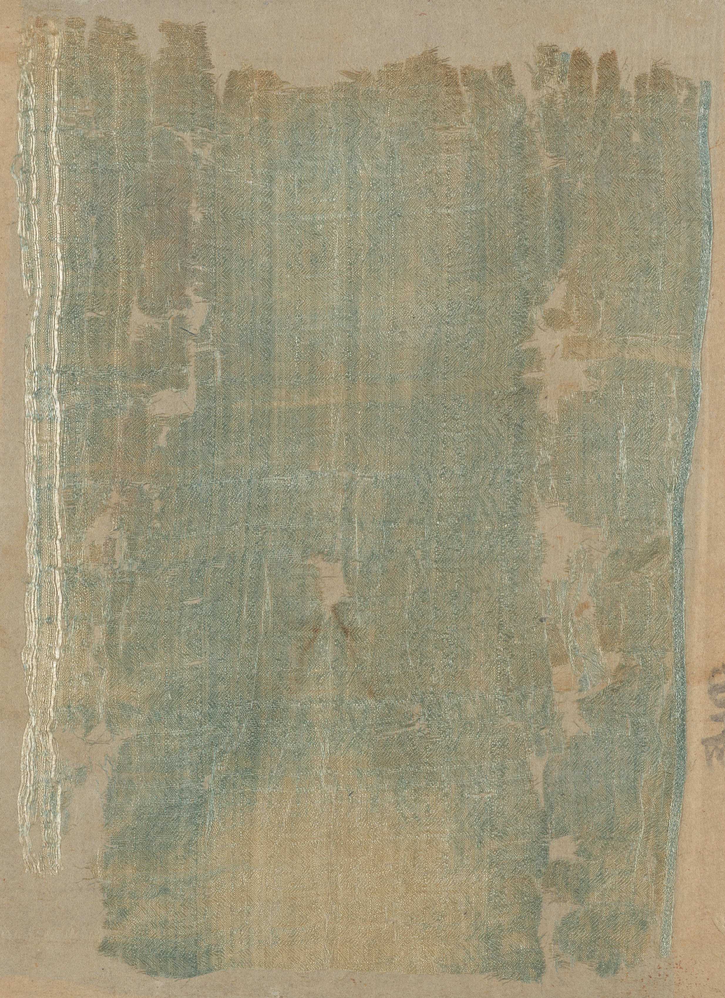 The artwork "Fragment" by the artist consists of a rectangular piece of aged paper with a rough texture. The dominant color of the piece is a faded greenish-blue hue that covers most of the surface, but it appears worn and distressed. The greenish-blue coloration seems to be peeling off in several areas, revealing a lighter brown color underneath. There are vertical streaks and uneven edges, particularly on the left side where the greenish-blue material appears to have been torn away, exposing a tan or beige background. The right edge of the artwork also shows signs of wear and tear, with similar peeling and fraying. The overall effect is one of decay and deterioration.