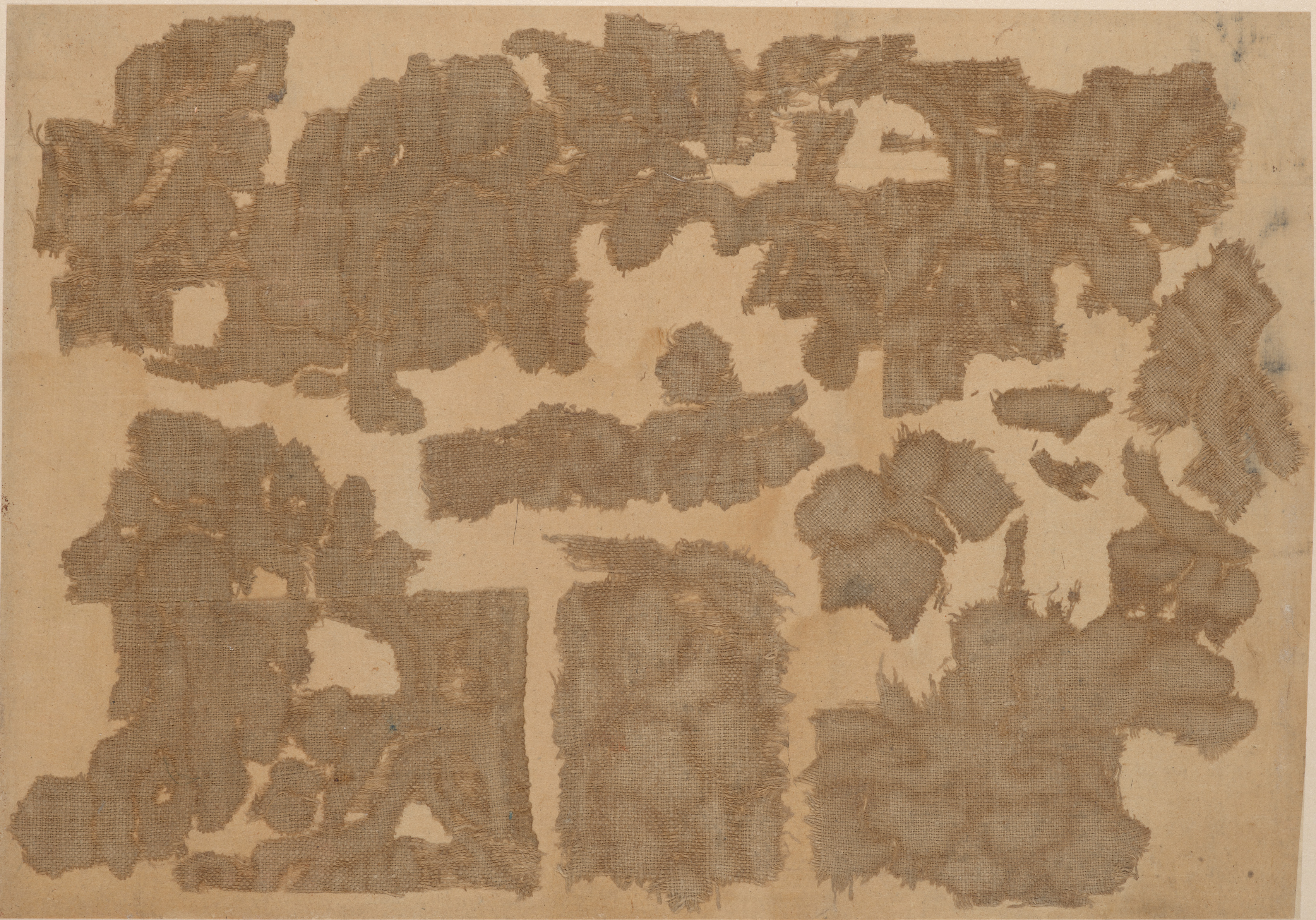 Brown fabric fragments on a tan background, numerous irregularly shaped pieces of brown fabric with frayed edges scattered across a tan surface, some pieces have holes or tears, fabric appears to be a woven material, possibly burlap or linen. "Fragment" by Robert Rauschenberg.