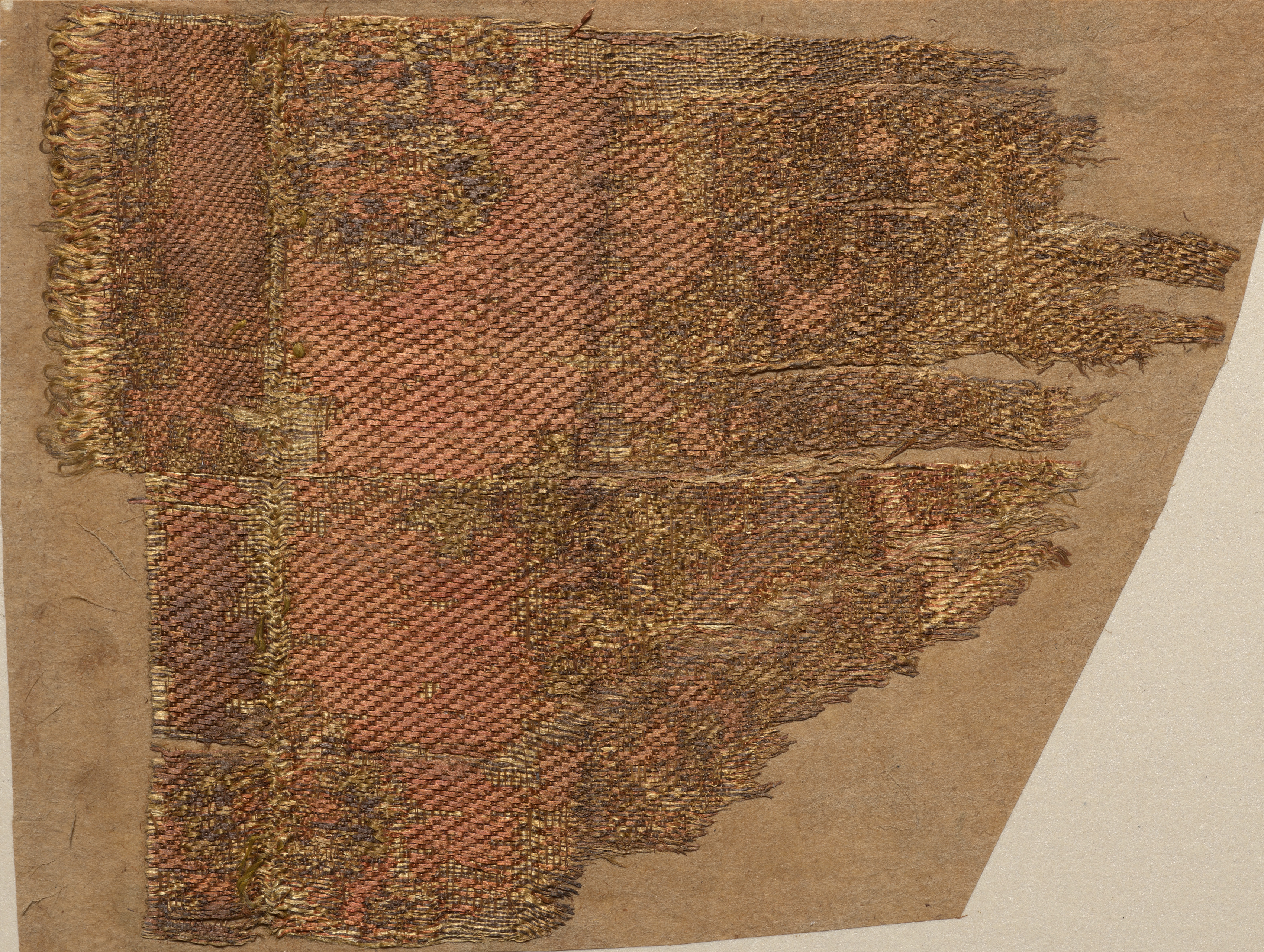 Fragment by Mikhail Makarov. A woven textile fragment on brown paper backing. The fragment is primarily composed of faded reddish-brown and gold-colored woven fabric. The fabric appears to be damaged and frayed at the edges. The background is a brown paper backing with visible creases and discoloration. The fabric's surface shows a complex pattern of interwoven threads in varying shades of gold and reddish-brown. Portions of the fabric are severely frayed and deteriorated.