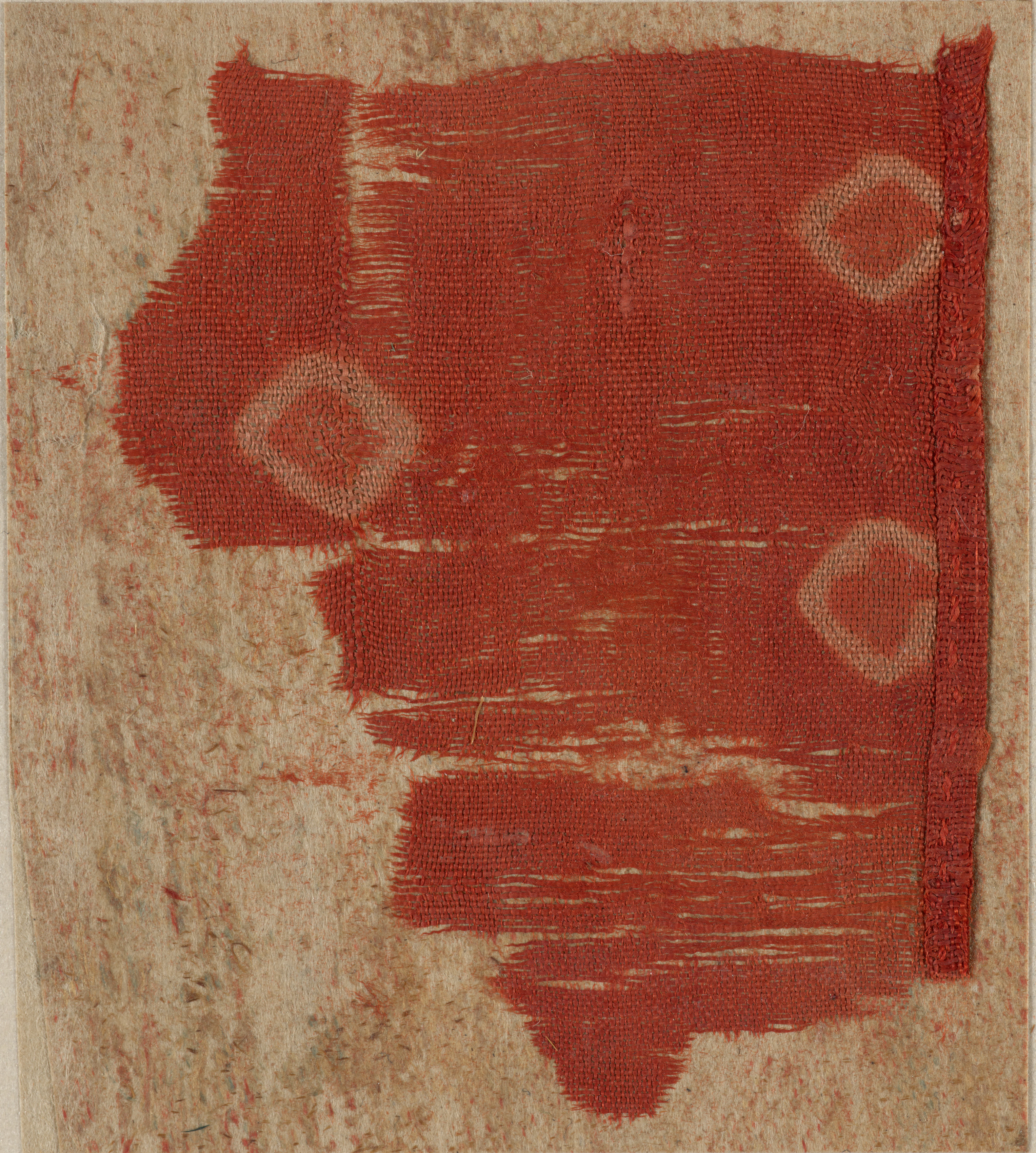 Red fabric with visible weave texture and frayed edges, on top of beige background. The red fabric is irregularly shaped. Two light-colored diamond shapes are visible on the fabric. The background appears to be a piece of cardboard or canvas with scattered red marks. The artwork is titled "Fragment" by an unidentified artist.