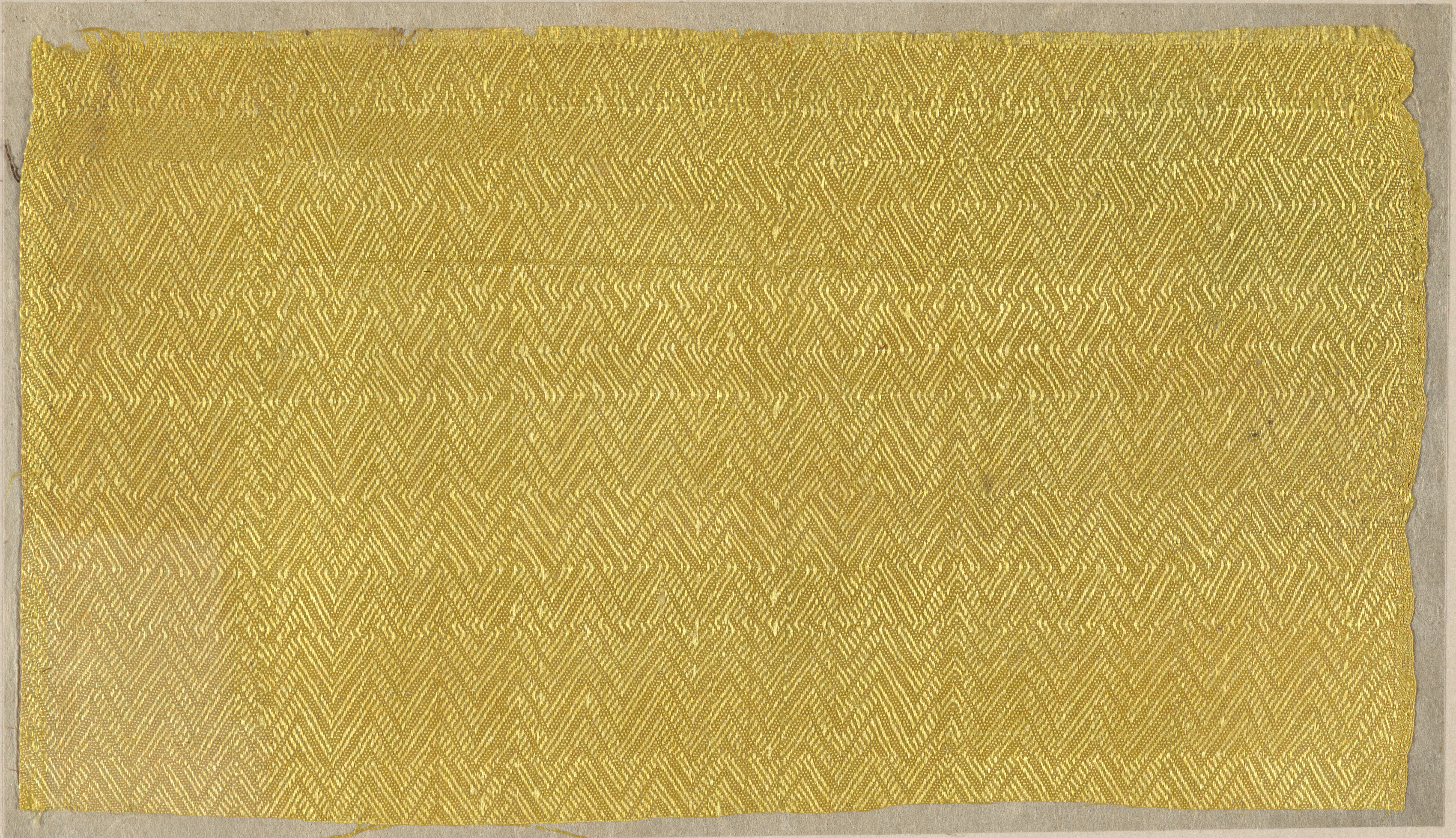 Gold-colored rectangular piece of fabric with a zigzag pattern. The fabric is mounted on a light brown background. The zigzag pattern consists of thin, interlocking lines that form a repeating design. The fabric has rough edges. The title of the piece is "Fragment" by an unknown artist.