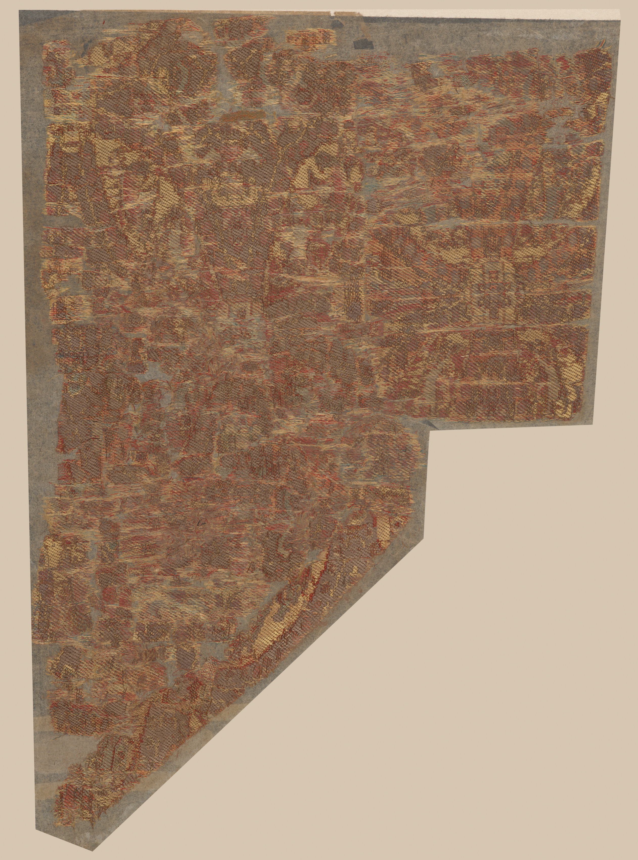 Fragment by Mark Rothko, a roughly L-shaped piece with a gray background and many shades of orange and red. The right angle of the L-shape protrudes to the right and up. The majority of the piece is on the left. The top half of the piece has many short, intersecting lines creating texture. The lines are predominantly a shade of orange. The bottom half also comprises many short intersecting lines in a range of orange and red hues, but the lines are longer and more fluid. The piece hangs on a beige background.