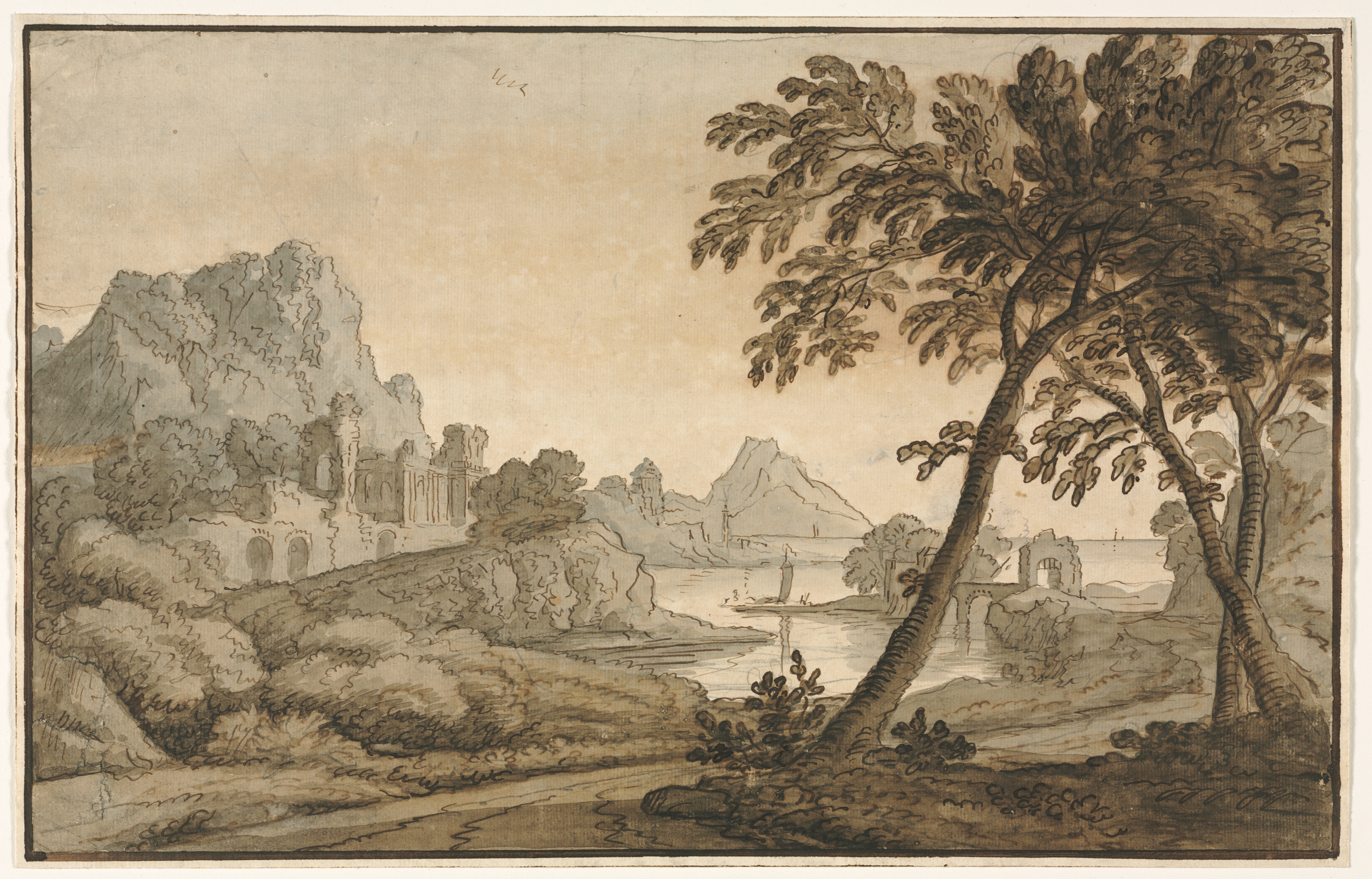 Italian Landscape by Rembrandt. The image depicts a landscape drawing with a beige background and brown and gray tones. The scene shows a body of water with a mountain in the distance. On the right side, there are two trees with long trunks and leafy branches. On the left side, there is a large rocky hill with a white building featuring arched doorways and columns. The building appears to be a ruin. In the background, there are more mountains and a few trees scattered throughout the scene. The drawing is framed by a thin black border.