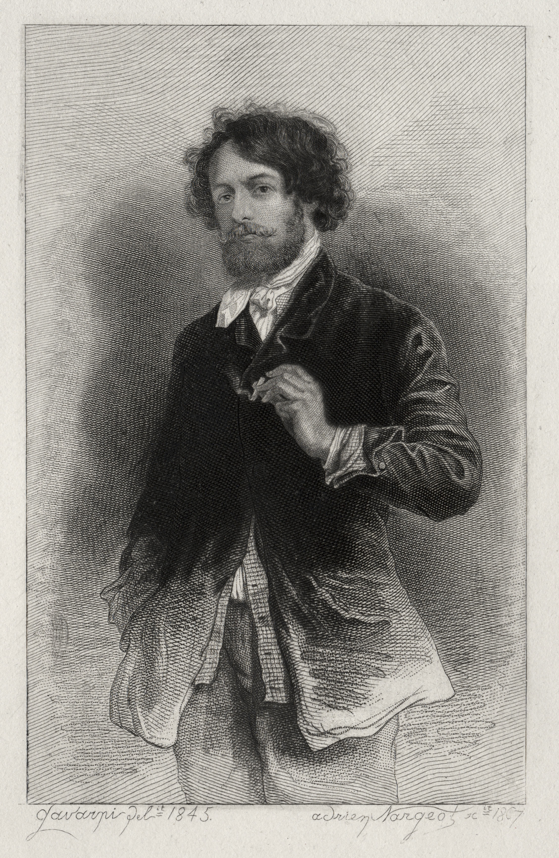 Black and white portrait drawing of a man. The man has curly hair and a beard. He is wearing a dark jacket with a white shirt and a patterned cravat. His right hand is raised to the lapel of his jacket. The background is shaded with darker tones behind the man. The drawing is signed in cursive at the bottom. The image is titled "Gavarni" and attributed to artist Adrien Nargeot.