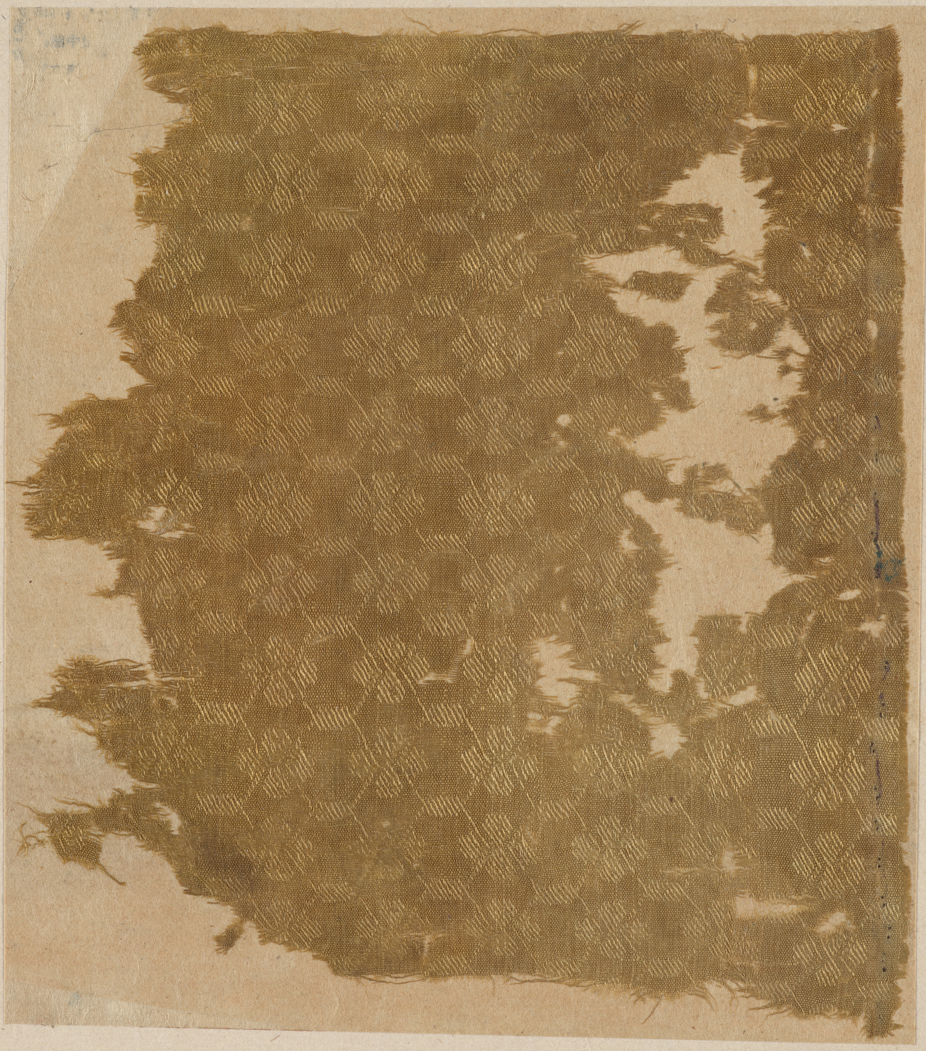 Brown fabric fragment with a woven diamond pattern on a beige background, frayed edges.
