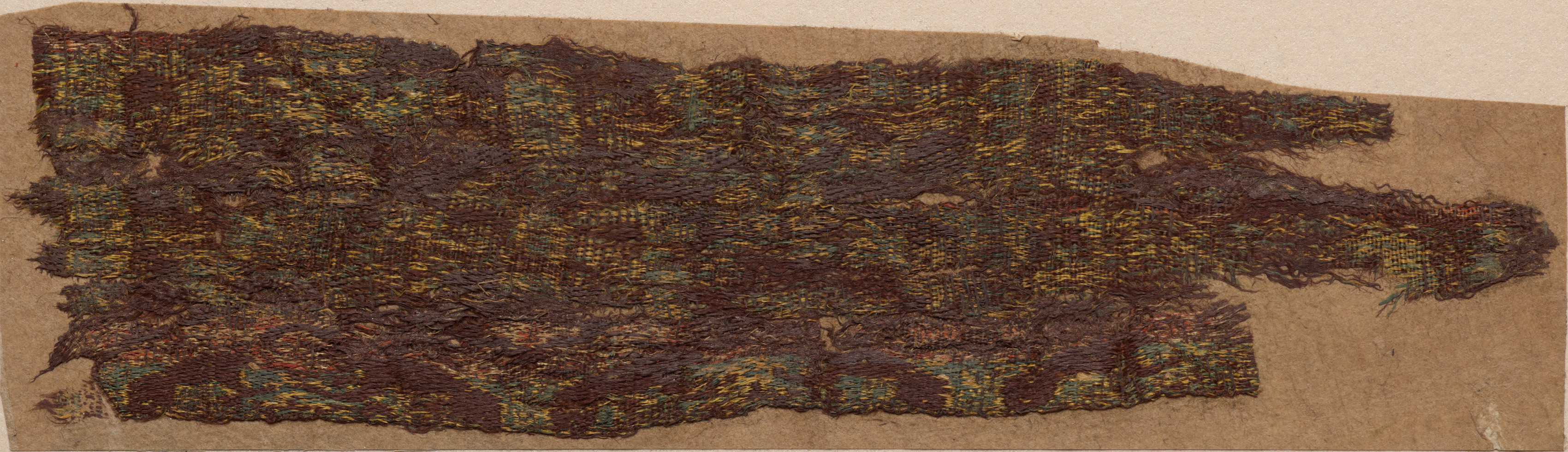 Rectangular fragment with frayed edges, mounted on a beige background. The fragment has a dark brown base color with multicolored threads woven throughout. The woven pattern includes shades of green, blue, yellow, orange, and red. Several areas of the fragment are torn or frayed, with loose threads visible. The beige background is visible around the edges of the fragment.