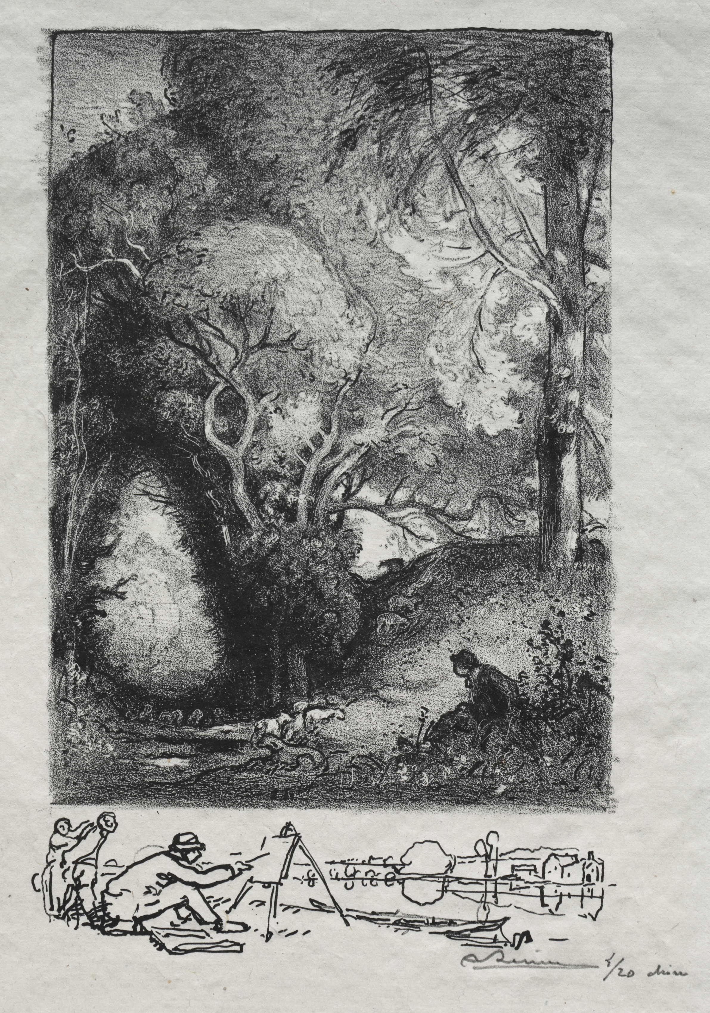 The image shows a black and white drawing titled "La Ravine en juin" by Auguste Louis Lepère. A large, rectangular drawing of a wooded area takes up most of the image. The drawing depicts trees with thick trunks and branches on a hillside. In the foreground, a person sits on the ground. At the bottom of the image, a smaller drawing shows a man sitting at an easel with a canvas, and another person standing beside him. The background of the main drawing resembles a distant landscape through the trees. The overall image is rendered in shades of gray, with darker tones used for shading and texture. The artist's signature appears in the bottom-right corner of the image.