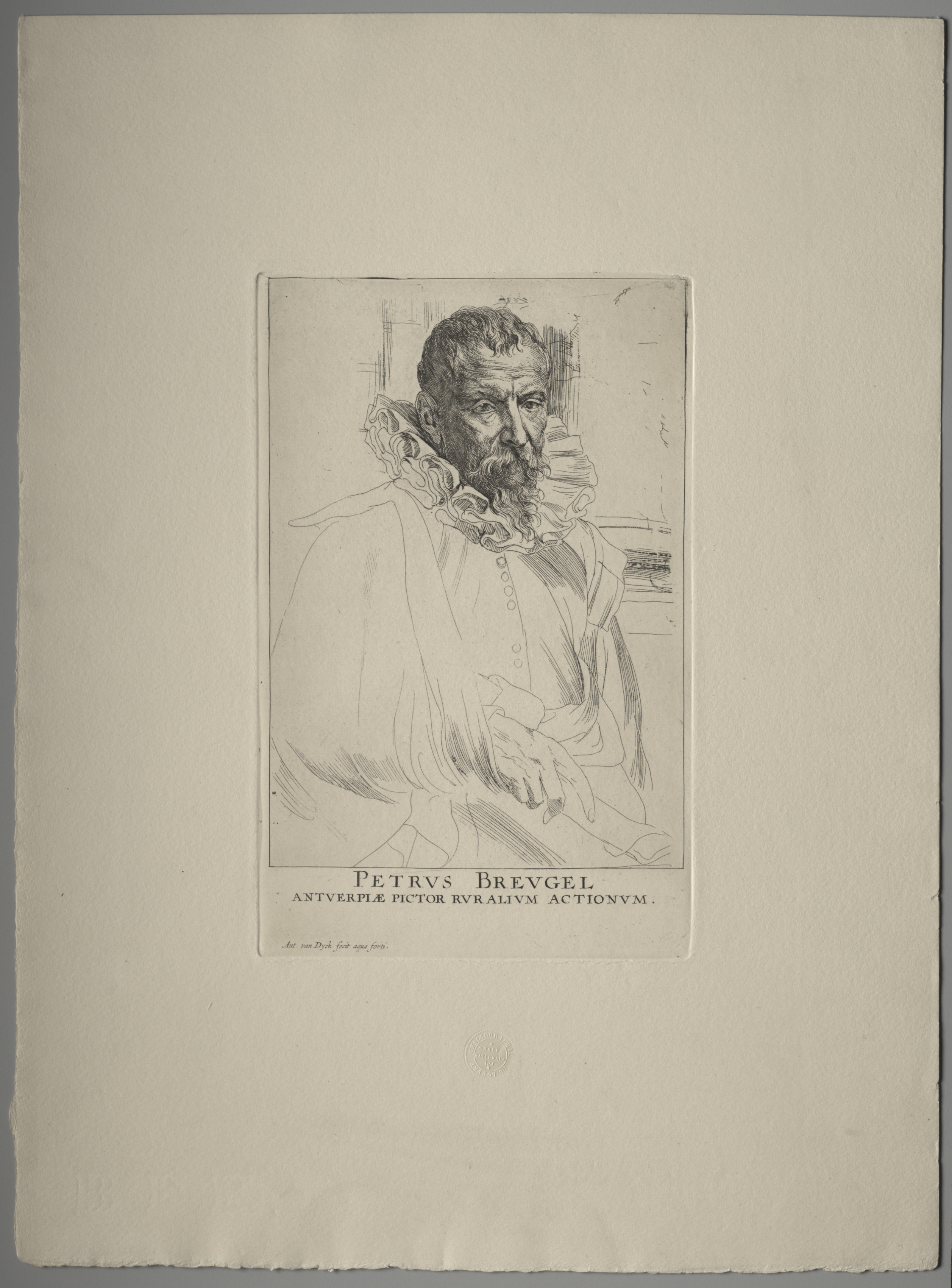 Black and white drawing of a man with short hair and a beard wearing a ruffled collar. The man is sitting and wearing a loose-fitting top with buttons down the front and a large ruffled collar. His left hand is resting on a surface in front of him, and his right hand is raised to his face. The drawing is on a rectangular piece of paper with a rough edge. There is text below the drawing: "PETRVS BREVGEL" on one line, and "ANTVERPLE PICTOR RVRALIVM ACTIONVM" on the second line. The drawing and paper are on a gray background. The overall image is by Anthony van Dyck, and it depicts Pieter Brueghel the Younger.