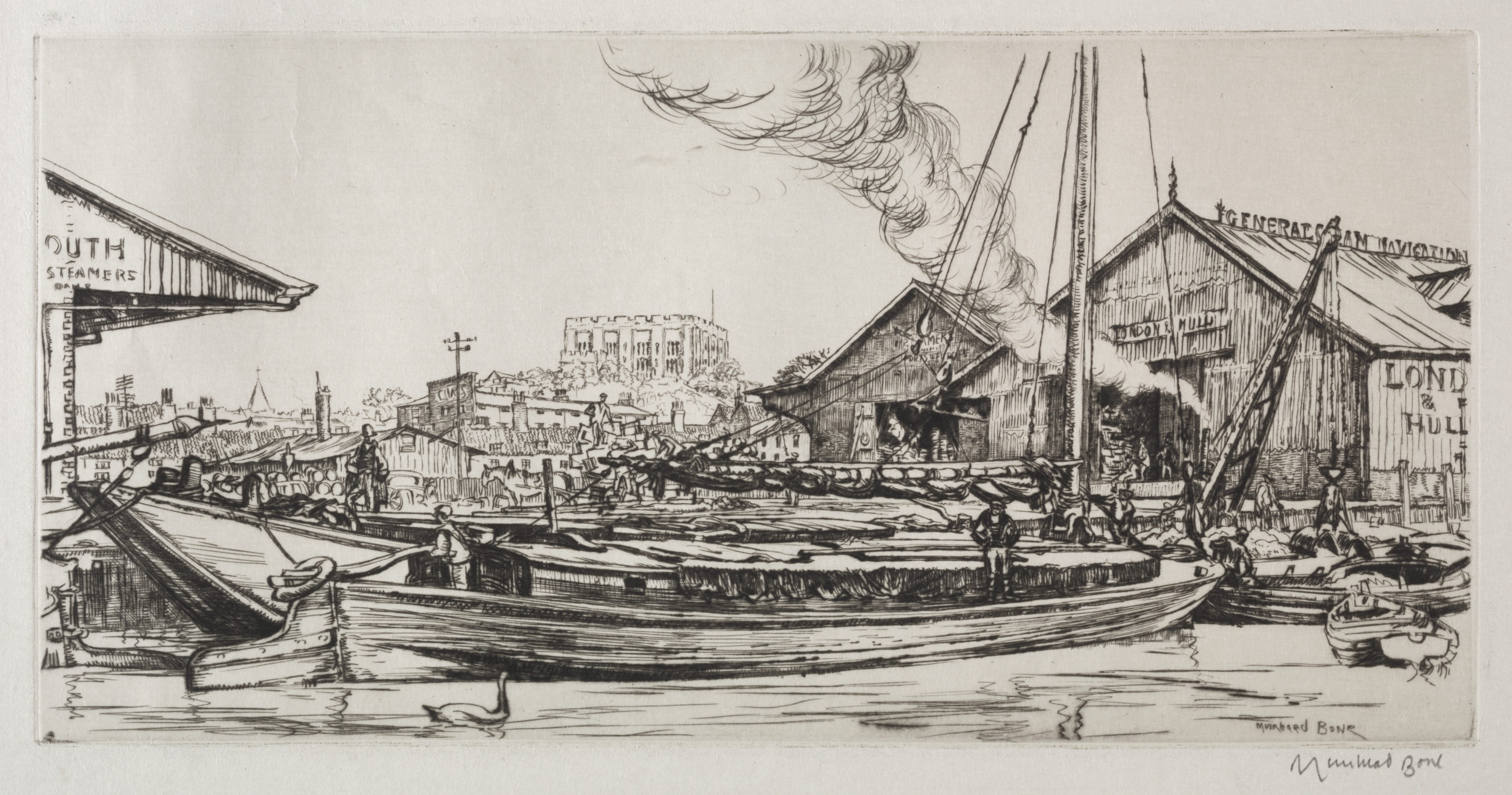 Black and white drawing of a docks scene with a boat. A large building with a roof supported by pillars to the left reads 'South Steamers'. Two large wooden buildings are on the right. A sign on one reads 'London for Hull'. A distant castle is visible. The sky is light with a thick plume of smoke. A bird swims in the water. A signature appears in the bottom-right corner.