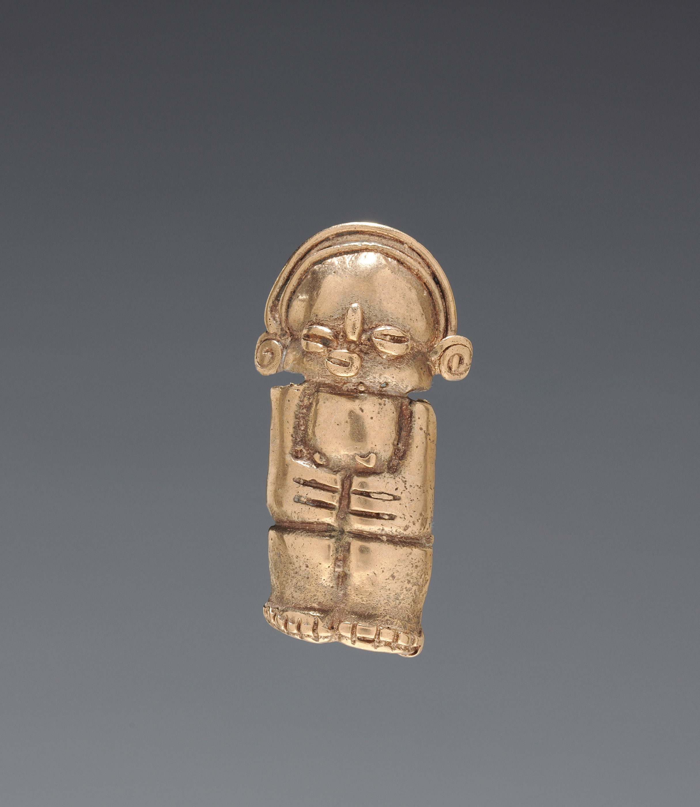 Gold figurine of a humanoid figure with a large head, small body. The head is rounded with a smaller rounded protrusion around the outer edge near the top. The face has two small circular ears on either side and an oval shaped eye in the center. The nose is a thin vertical line. The body is rectangular with horizontal lines on the chest. The feet are also carved into the bottom. The background is grey and white. The artist and title of the piece are "Necklace Figurine Bead".