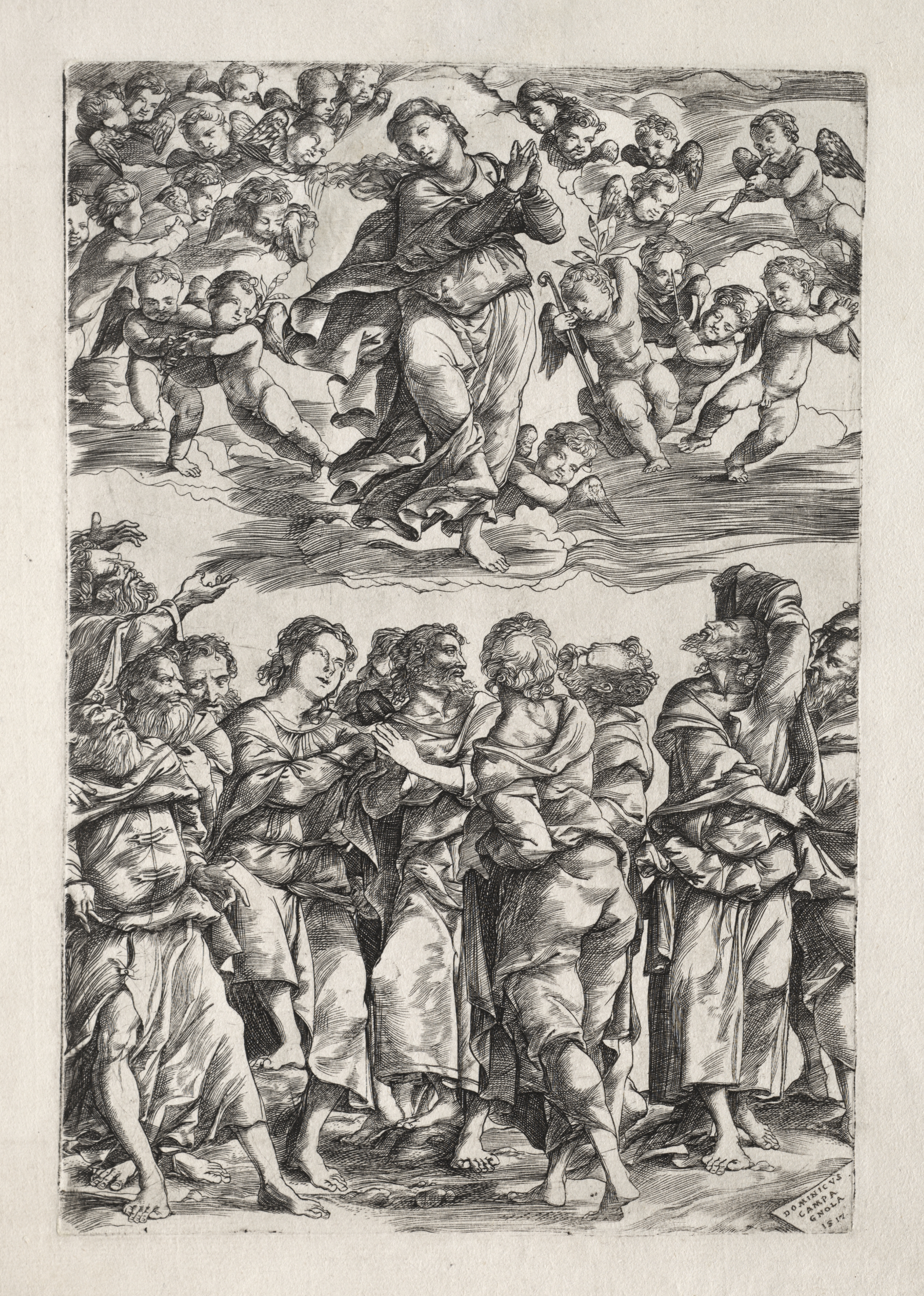 Black and white drawing of two scenes. The top scene depicts a woman with long hair wearing a long dress being lifted into the air by cherubs. The cherubs are nude and have wings; some carry objects. The bottom scene shows a group of about 10 people dressed in long robes looking up. The people are standing on a ground with some rocks. The drawing is on a beige background. The title is "The Assumption of the Virgin" and the artist is Domenico Campagnola.