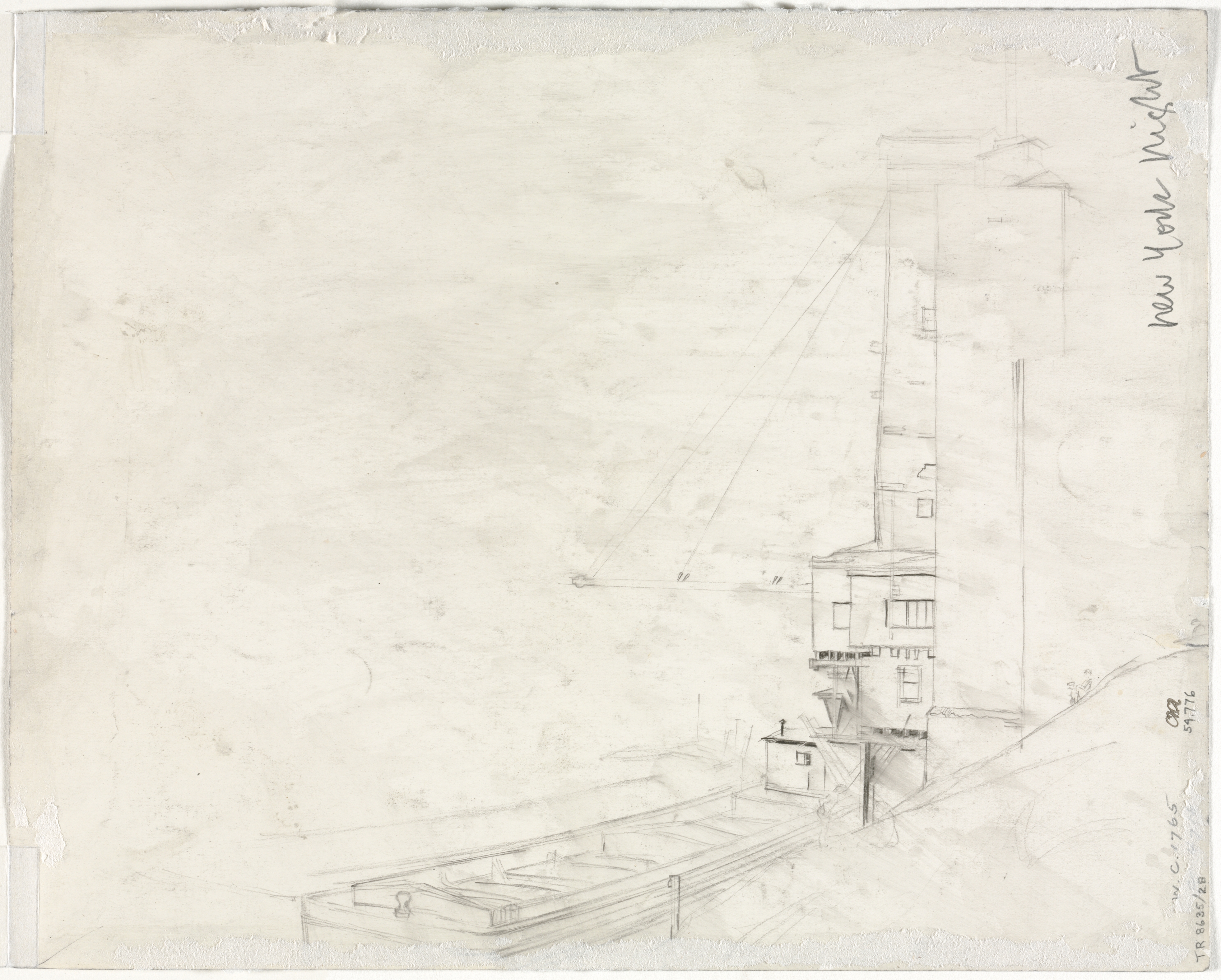 Pencil drawing on off-white paper with visible smudges. A tall building with a flat roof and several windows is on the right side. A platform or dock with railings is in the foreground. The building's facade has a mix of rectangular shapes. Handwritten text is on the right edge: vertically oriented "New York Night" and horizontally oriented numbers.