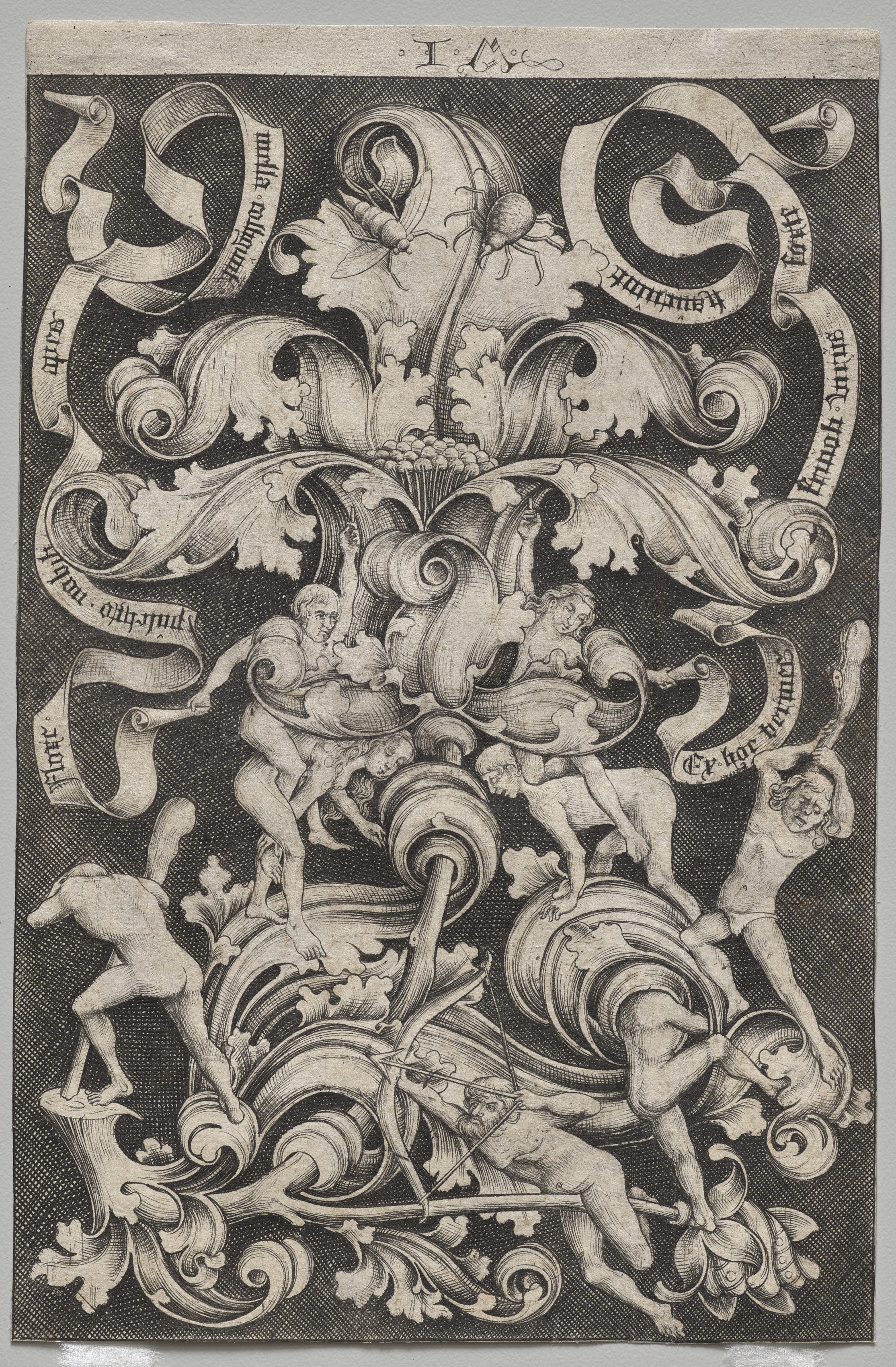 Black and white engraving of an ornate design with curvy, flowing lines that resemble leaves and tendrils. The design features eight naked men positioned throughout. The men are posed in various dynamic stances, with some climbing or supporting the ornate structure. There are several curved ribbons with text written in an old-fashioned font. The background of the engraving is dark gray with a lighter gray border around the edges. The overall composition is intricate and detailed, with many elements intertwined. The text on the ribbons appears to be in German. The engraving style suggests an old master artwork. The design is symmetrical with a central focal point. There are flowers and leaves throughout the composition. The men are depicted without clothing. The artwork showcases detailed linework.