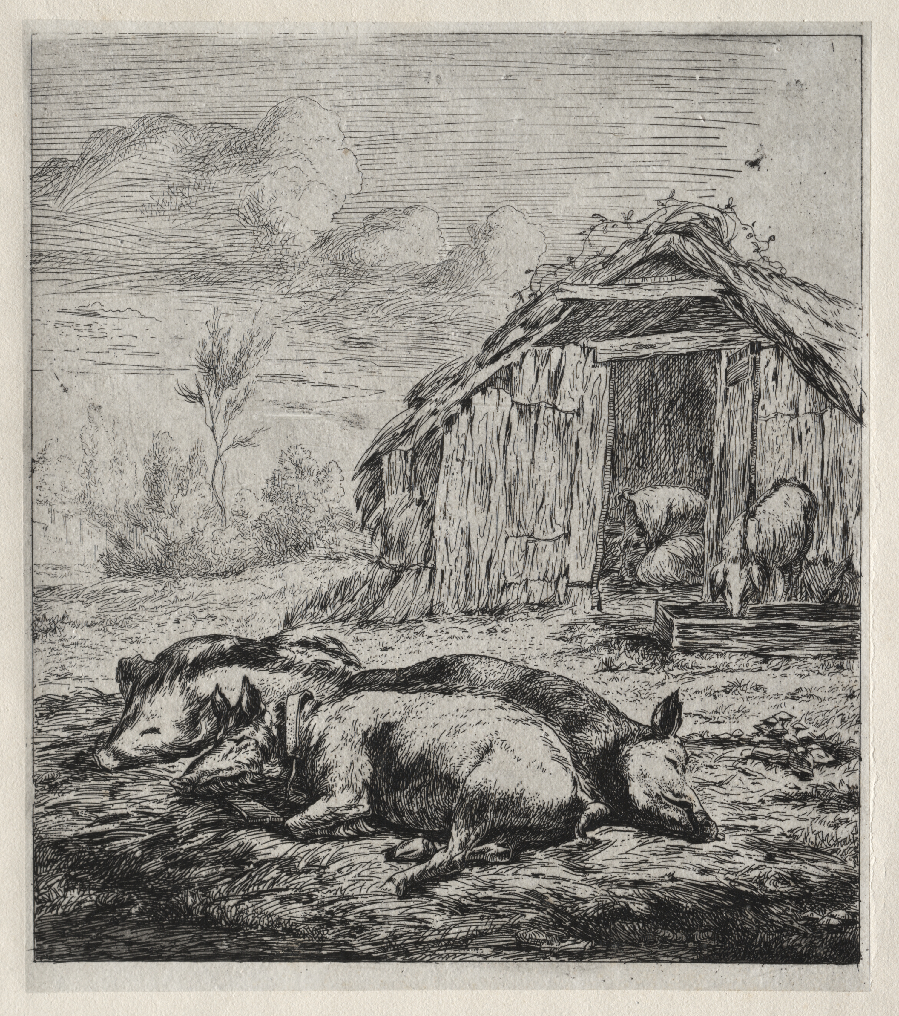 Black and white image of three pigs lying on ground, two in foreground and one behind them to the left. Pigs are lying on their sides. The pigs in the foreground are lying with their heads in opposite directions. The pig in the background faces right. The pigs are in front of a wood and thatched roof structure, resembling a barn or pen. There are two bales inside the structure. The background contains trees and a cloudy sky. The image is framed by a thin border. The work is called "Three Swine Lying in Front of a Sty" and was created by Charles Meryon.