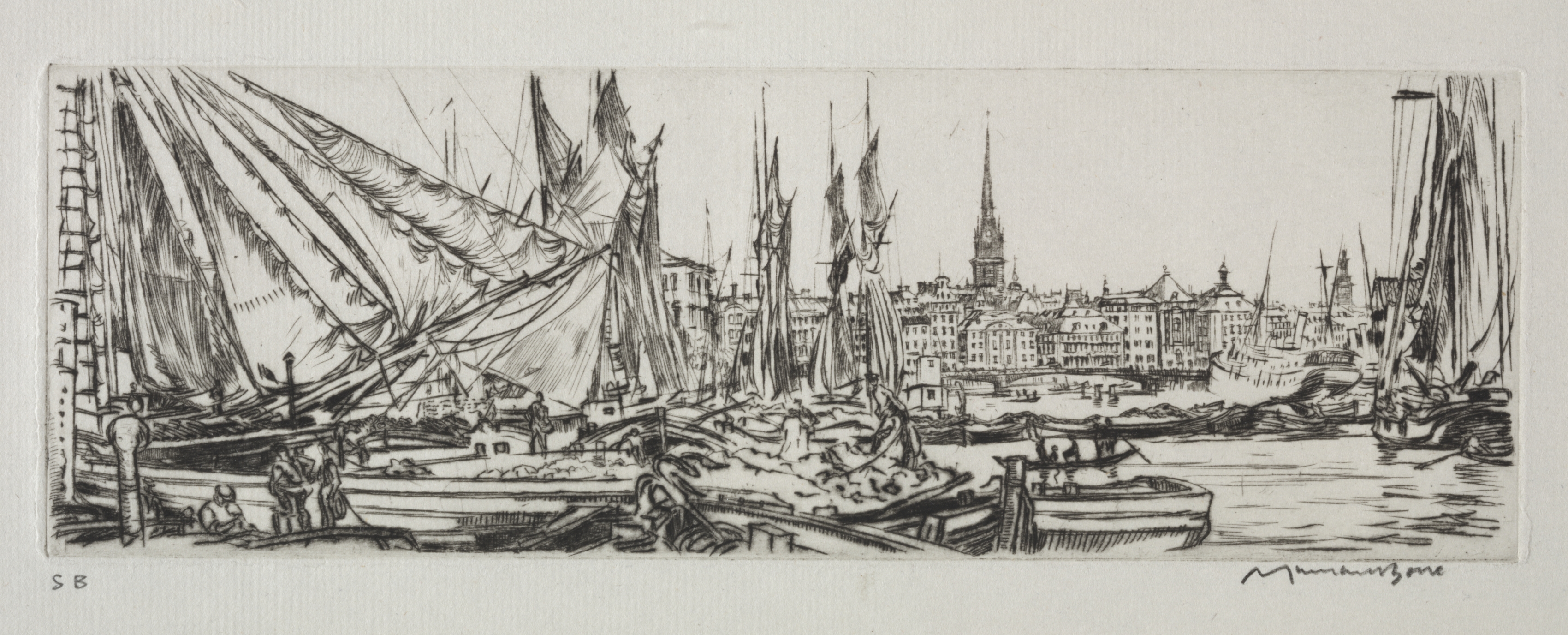 Black and white etching of a harbor scene. Boats are docked in the foreground and in the water to the right. Large boats with billowing sails are on the left and in the middle. A city skyline with many buildings and a tall steeple is in the background. The waterway leads to the background. A signature is in the lower right corner and two letters and a capital letter are in the lower left corner.