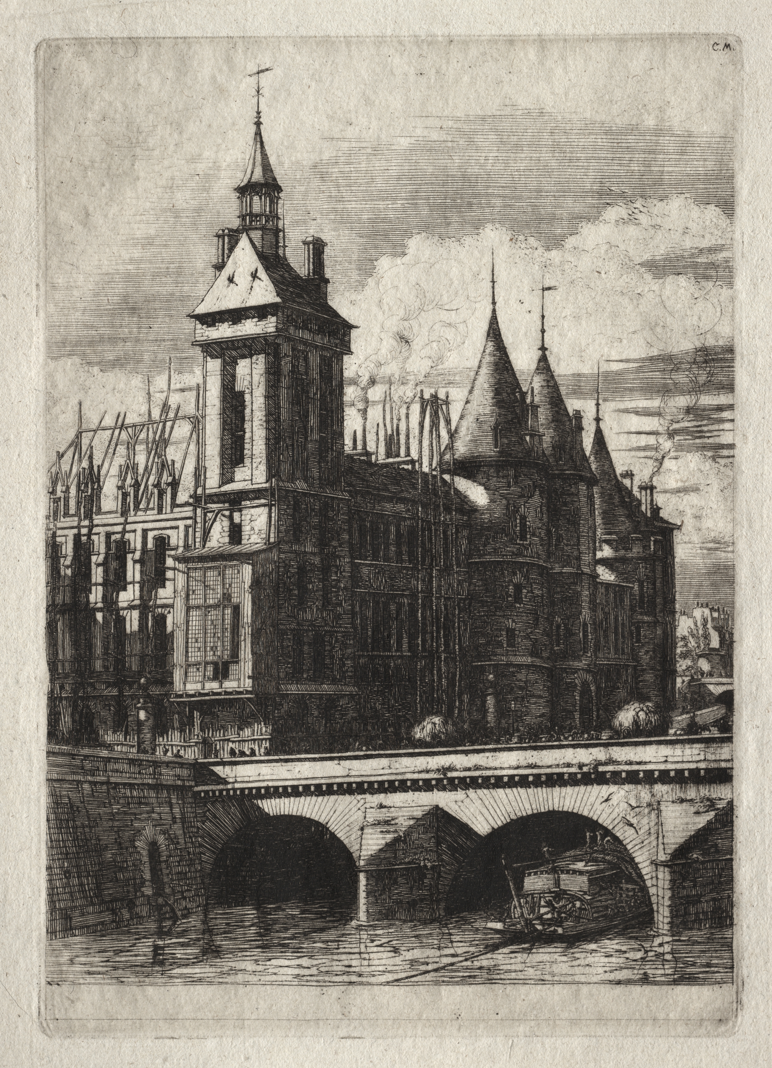 Black and white etching of a large building with a clock tower, bridge, and river. The building has a tall clock tower on the left with a steeply pitched roof and a weather vane on top. The main building has three conical roofs. There is a short bridge in the foreground with two arches and a stone railing. The bridge spans a river that runs along the bottom of the image. The background shows a cloudy sky. The image is in a rectangular format with a light-colored border around the etching.
