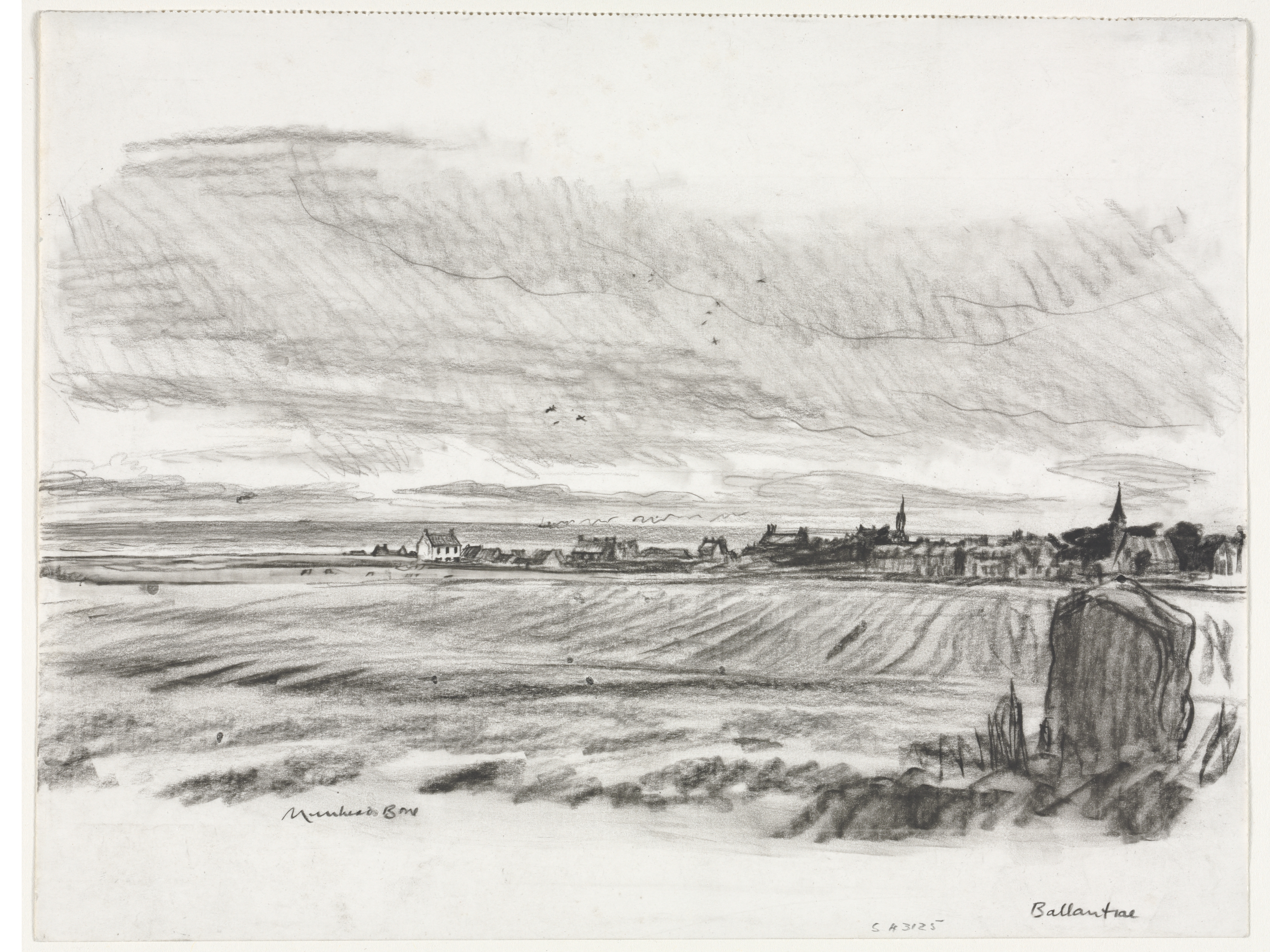 The image depicts a grayscale pencil drawing titled "Ballantrae" by Muirhead Bone. The drawing features a landscape with a field in the foreground and a town in the background. The field has short, uneven lines suggesting rough terrain. In the bottom-right corner, a rocky cliff juts out. The town has several buildings, two with prominent spires. The sky above is cloudy and overcast with visible birds. The artist's signature is in the bottom-left corner. The title "Ballantrae" is written in the bottom-right corner. The overall scene is rendered in varying shades of gray on a white background.