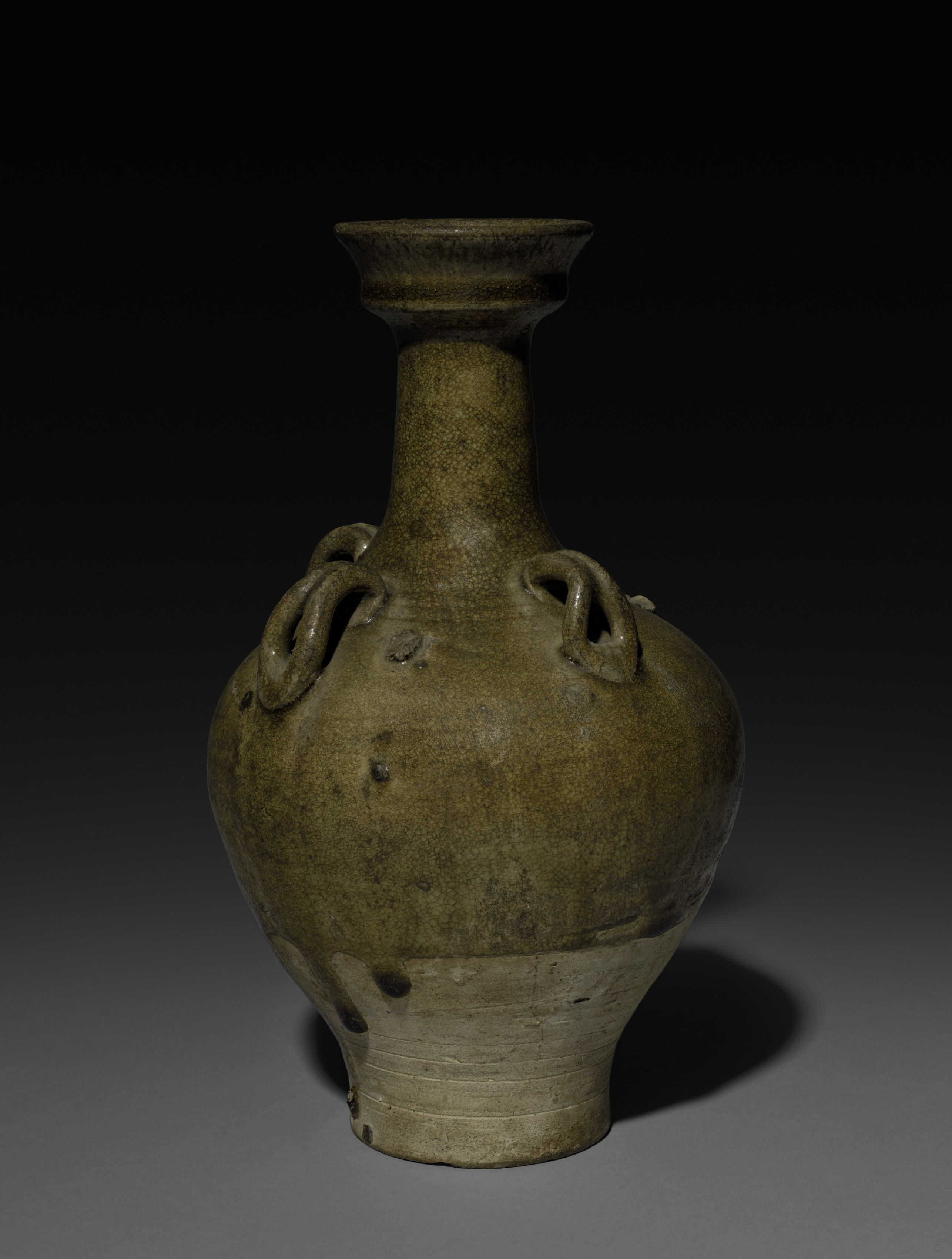 Olive-green vase with loop handles. Bulbous body. Short neck. Flared mouth. Dark background. Gray surface. Two loop handles on either side.