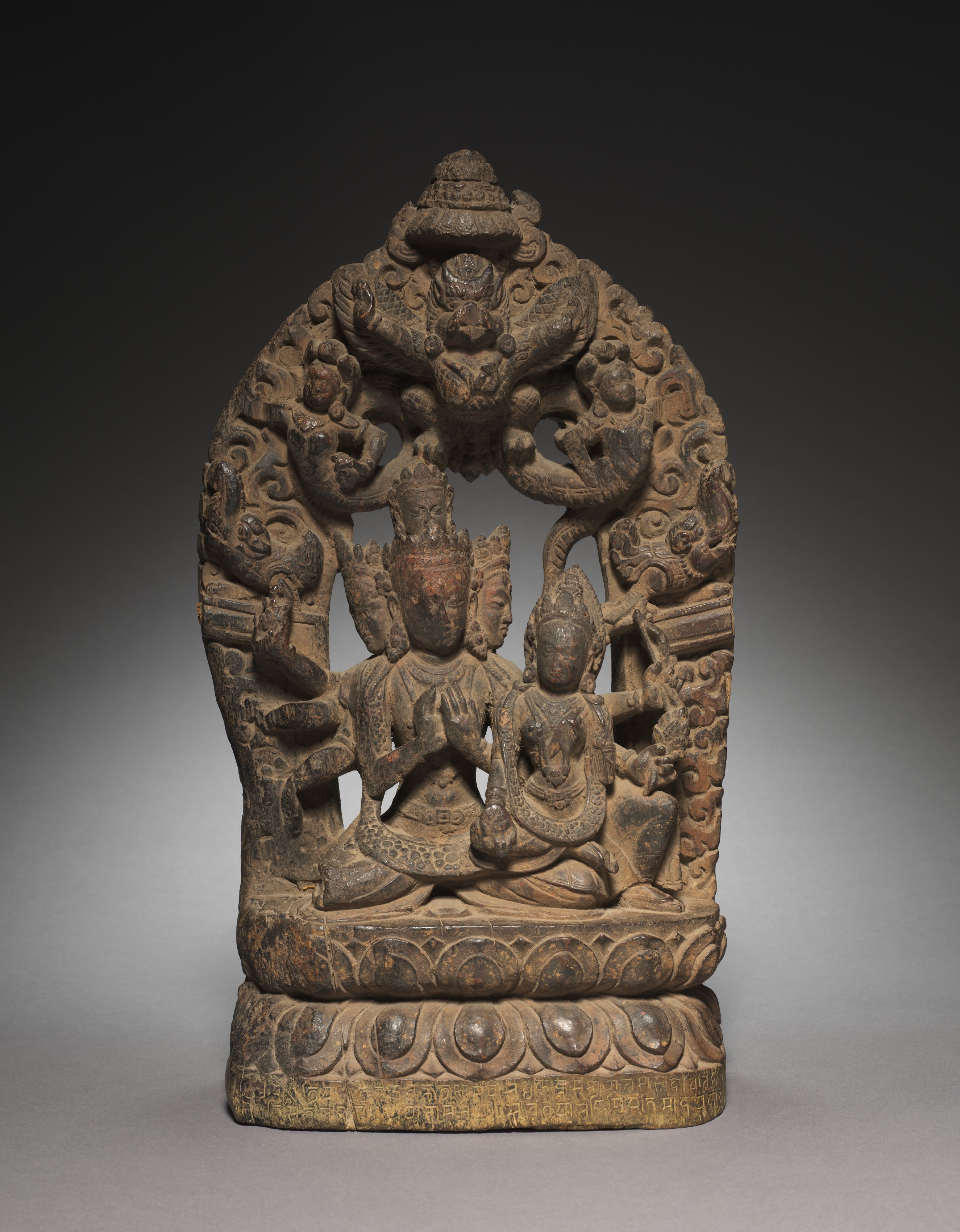 Brown stone sculpture with a wide base and rounded top featuring a central figure of a seated male, Avalokiteshvara, with four arms. He sits with his consort, a smaller female figure, Green Tara, on his lap. Both figures wear ornate robes and headdresses. The sculpture has a rounded base with an ornate pattern and a gradient background transitioning from dark to light gray. The figures' faces are serene. Avalokiteshvara's hands are positioned in front of him in prayer, while the other two hands hold objects. The female figure's hands are together in prayer. The sculpture showcases intricate carvings and details, with the figures positioned within an ornate arch.