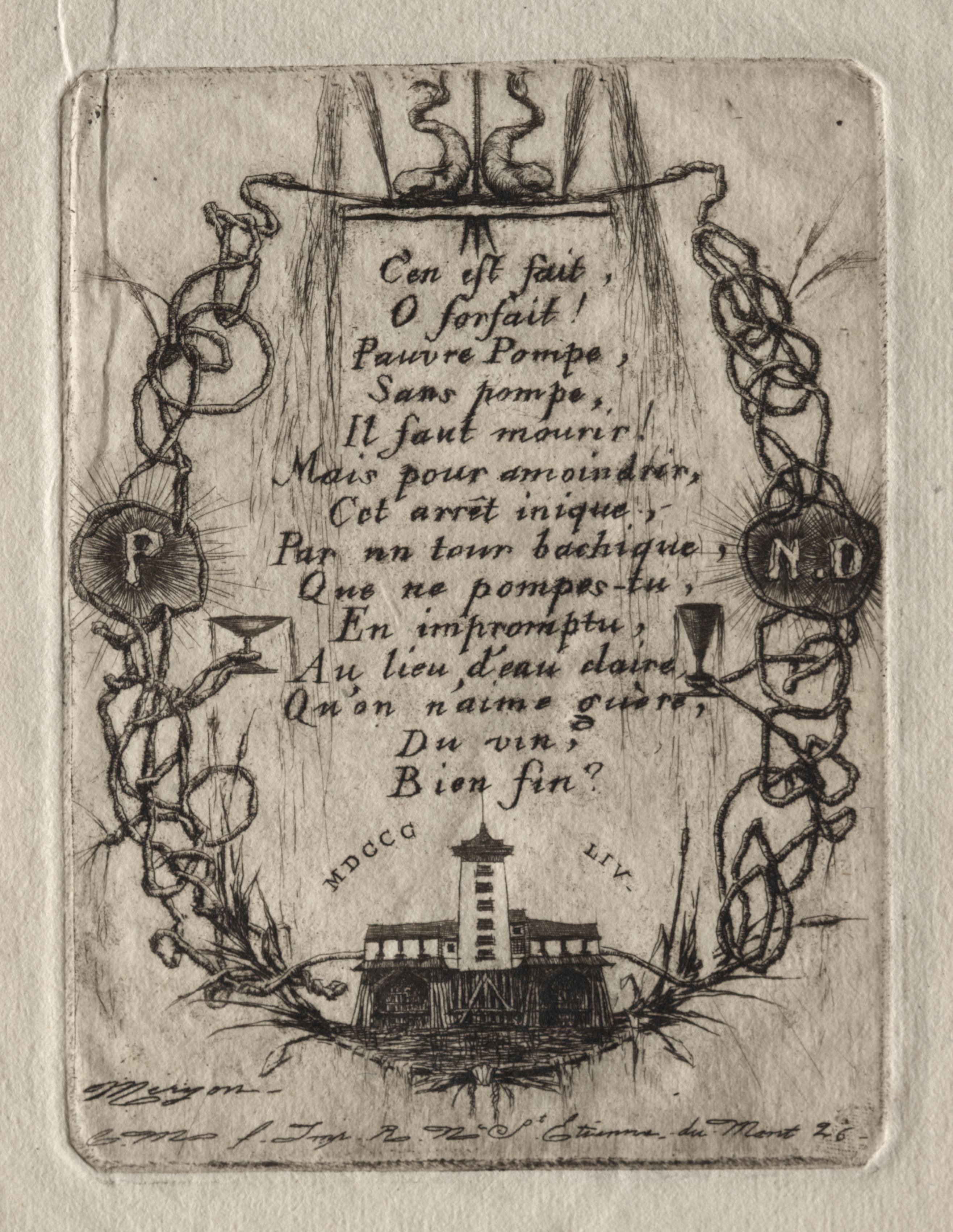 Black and white etching on off-white paper. Rectangular with rounded corners. Decorative border of intertwining ropes with two circular medallions. Left medallion has a capital P. Right medallion has ND. Border sits atop a small building with a tower roof. Text in French fills center.