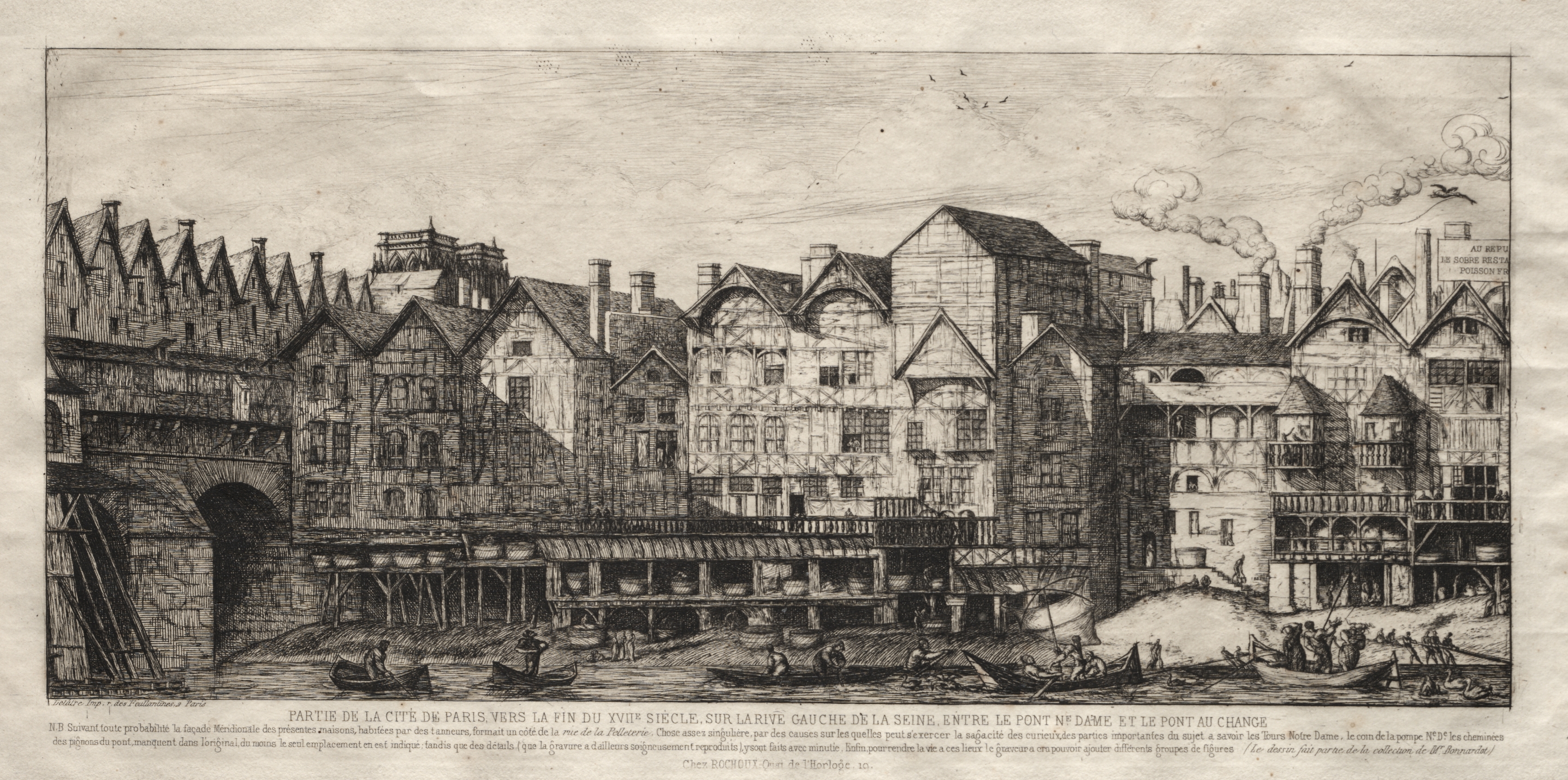 Black and white image of a city scene. A bridge with an archway on the left side spans a river. The river runs horizontally across the bottom. Boats are on the river. Buildings line the river, most have steeply pitched roofs and chimneys. Roofs of buildings on the right side appear to have scaffolding. A large building on the right side has a sign. People and birds are in the sky and on the river. The image is rectangular. Text is at the bottom.