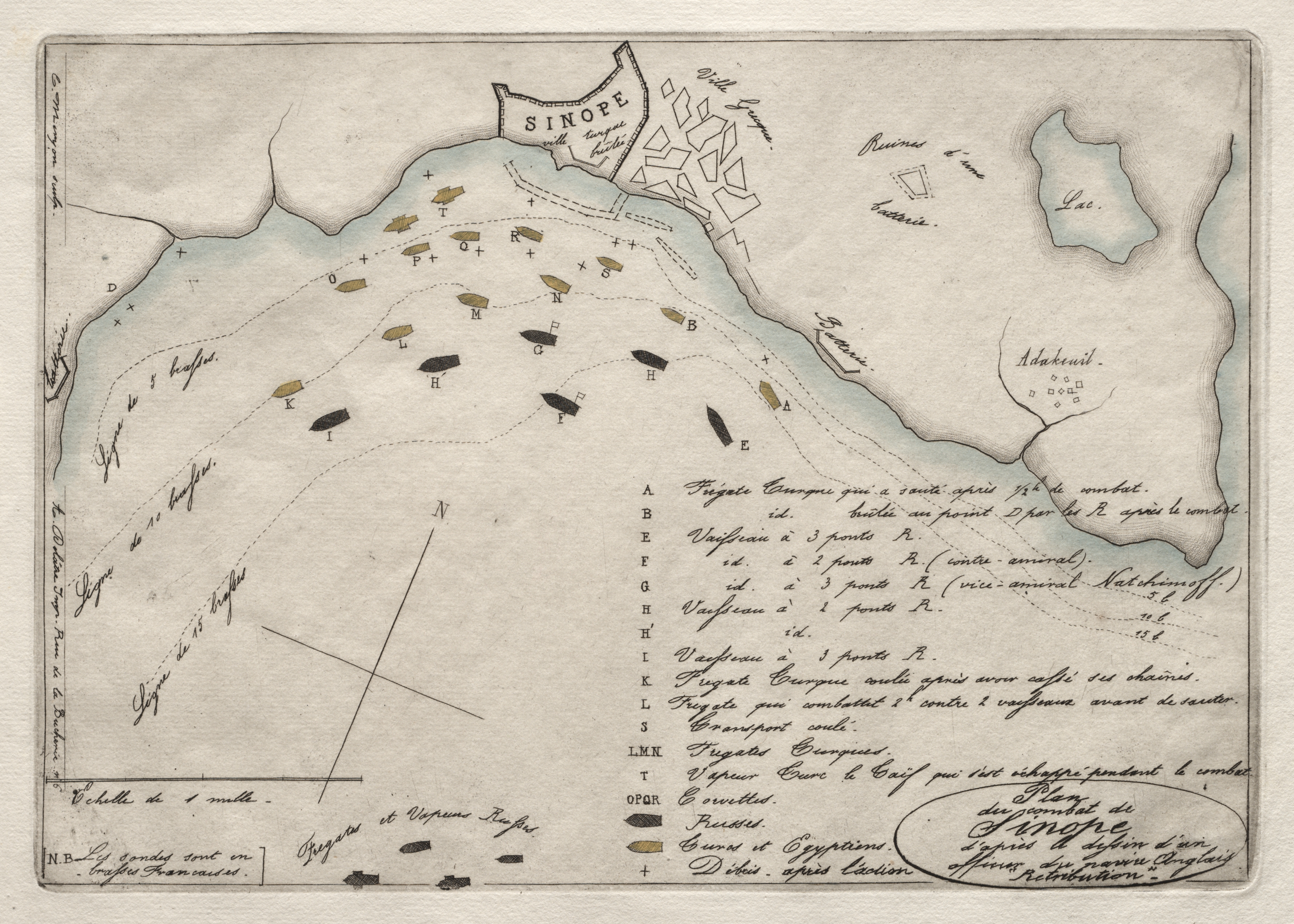 Map titled "SINOPE" showing a coastline with bodies of water and land. A peninsula with a city or town labeled "SINOPE" is at top center. There are various symbols and markings throughout, including ships and boats on the water, labeled with letters. A key or legend on the bottom right explains the symbols. A compass with a long line extending from it is on the left. The map has a thin black border around the edges. The background of the map is beige with blue areas representing water. Handwritten text in French is throughout the map.