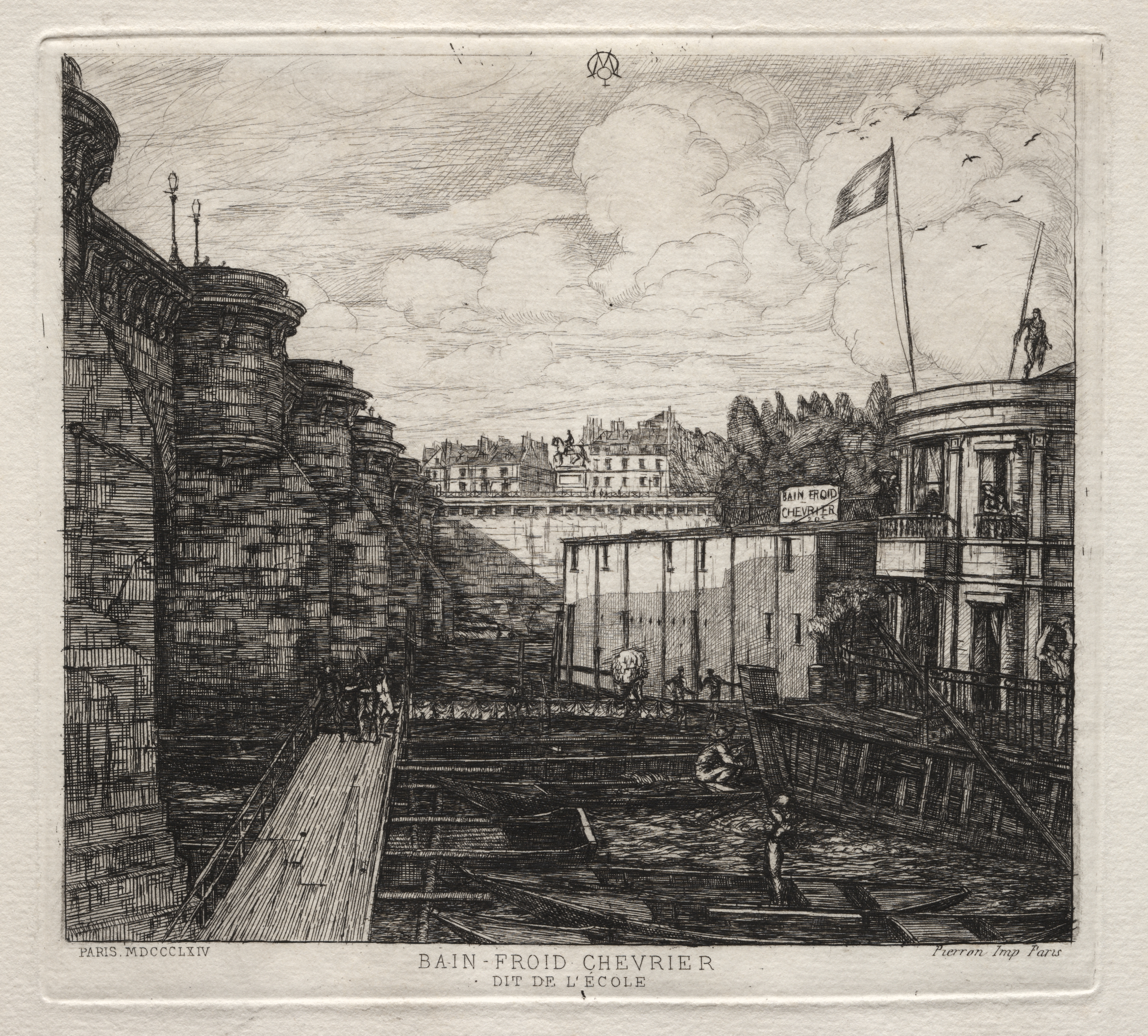 Black and white etching of a courtyard scene with buildings on the right and left. A flagpole flying a flag is on the right. A person sits on steps leading into a below-grade pool of water. The walls are made of stone and there are people throughout the scene. The background shows a cloudy sky and distant buildings. The text at the bottom reads "BAIN-FROID CHEVRIER" and "DIT DE L'ECOLE".