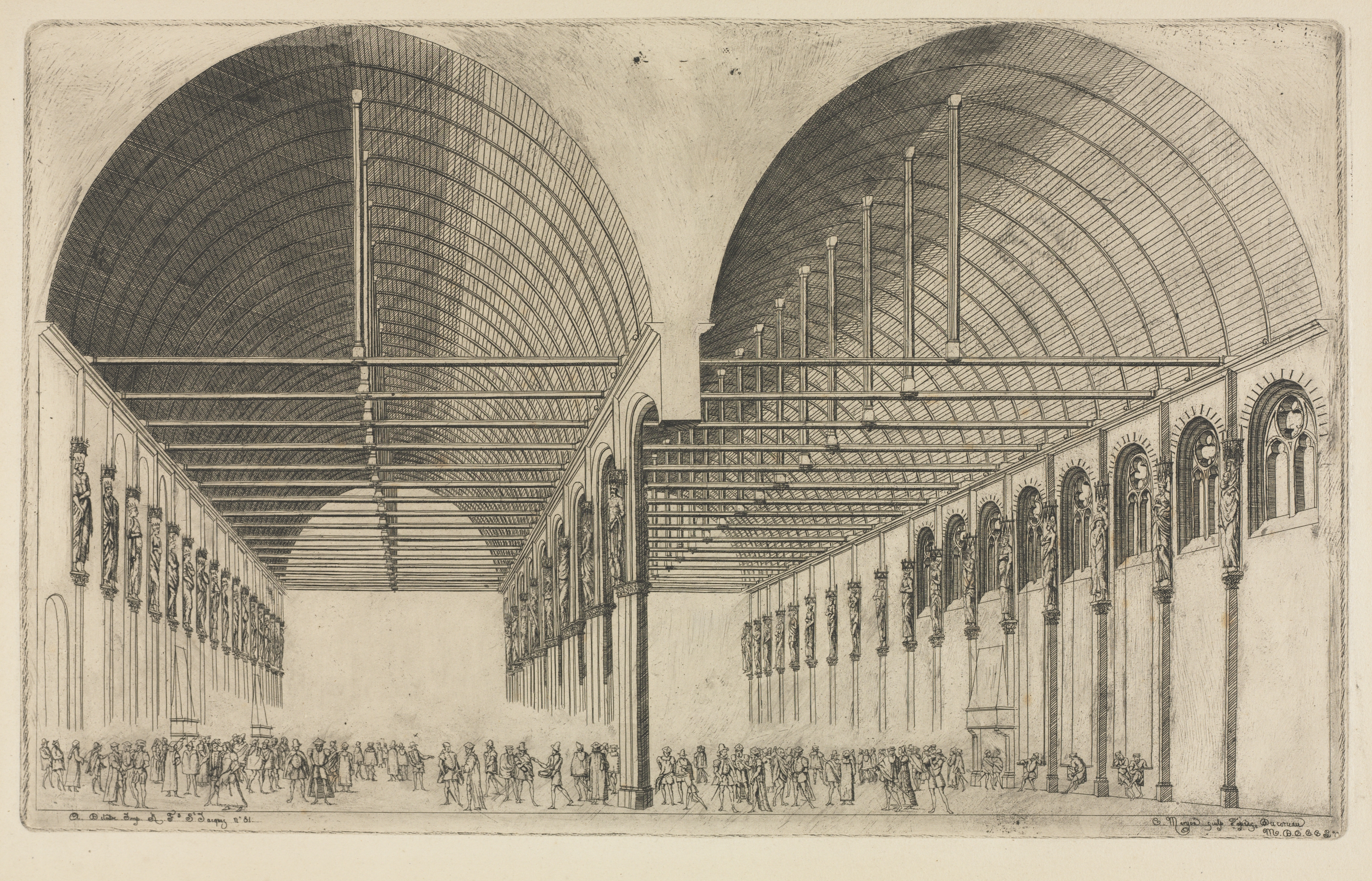 The image depicts a large, high-ceilinged room with a crowd of people. The room has a long, rectangular shape with a high, domed ceiling. Two large, rounded sections of the ceiling are visible, each divided into sections by thin lines. A series of thin, vertical poles rises from the floor to the ceiling. The walls on either side of the room are lined with tall, thin columns and arches. Between the columns are statues. The floor is filled with a crowd of people dressed in old-fashioned clothing. They appear to be walking or standing in groups. The overall atmosphere suggests a formal or official setting. The image is rendered in shades of gray and beige.