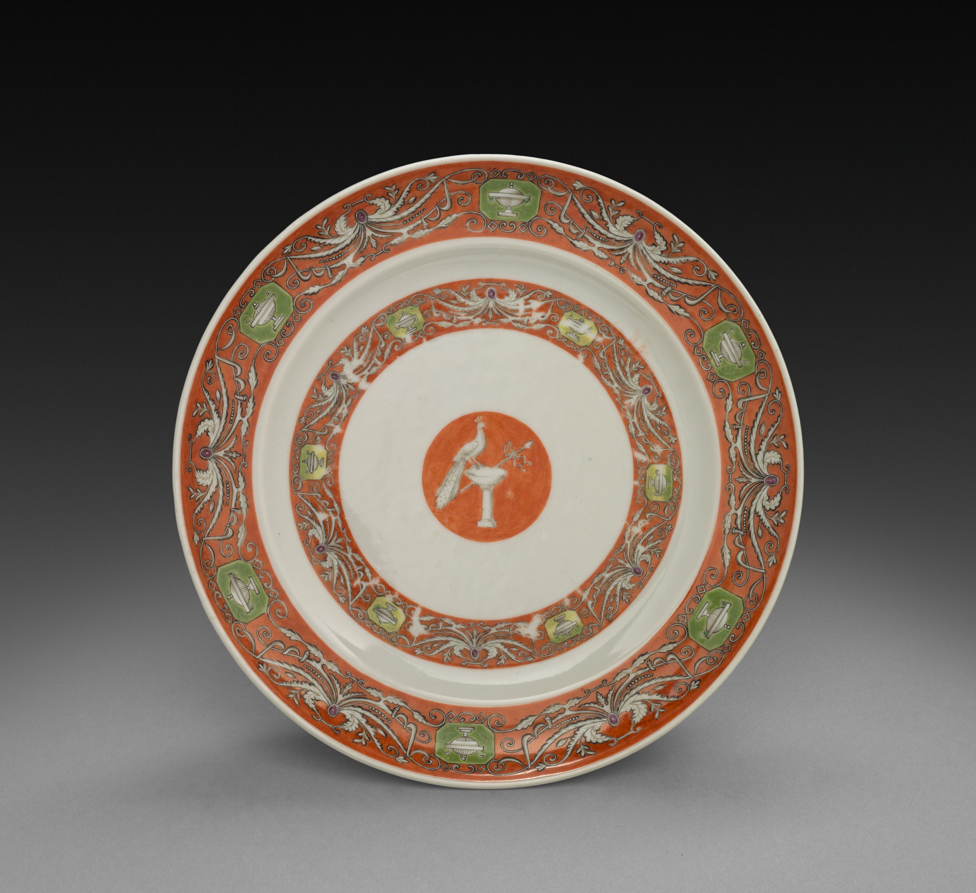The plate by artist Spode has a white background. The plate's center features a white bird on an orange-red circle; the bird perches on an altar-like object with a long neck, facing left, and extends its right wing. The inner ring displays curved dark orange leaves on a white background. The outer ring features green squares adorned with white Chinese architectural details in a symmetrical arrangement; a twisted vine-like silver design surrounds the green squares on an orange-red background. The plate sits on a gray gradient background that darkens towards the top.