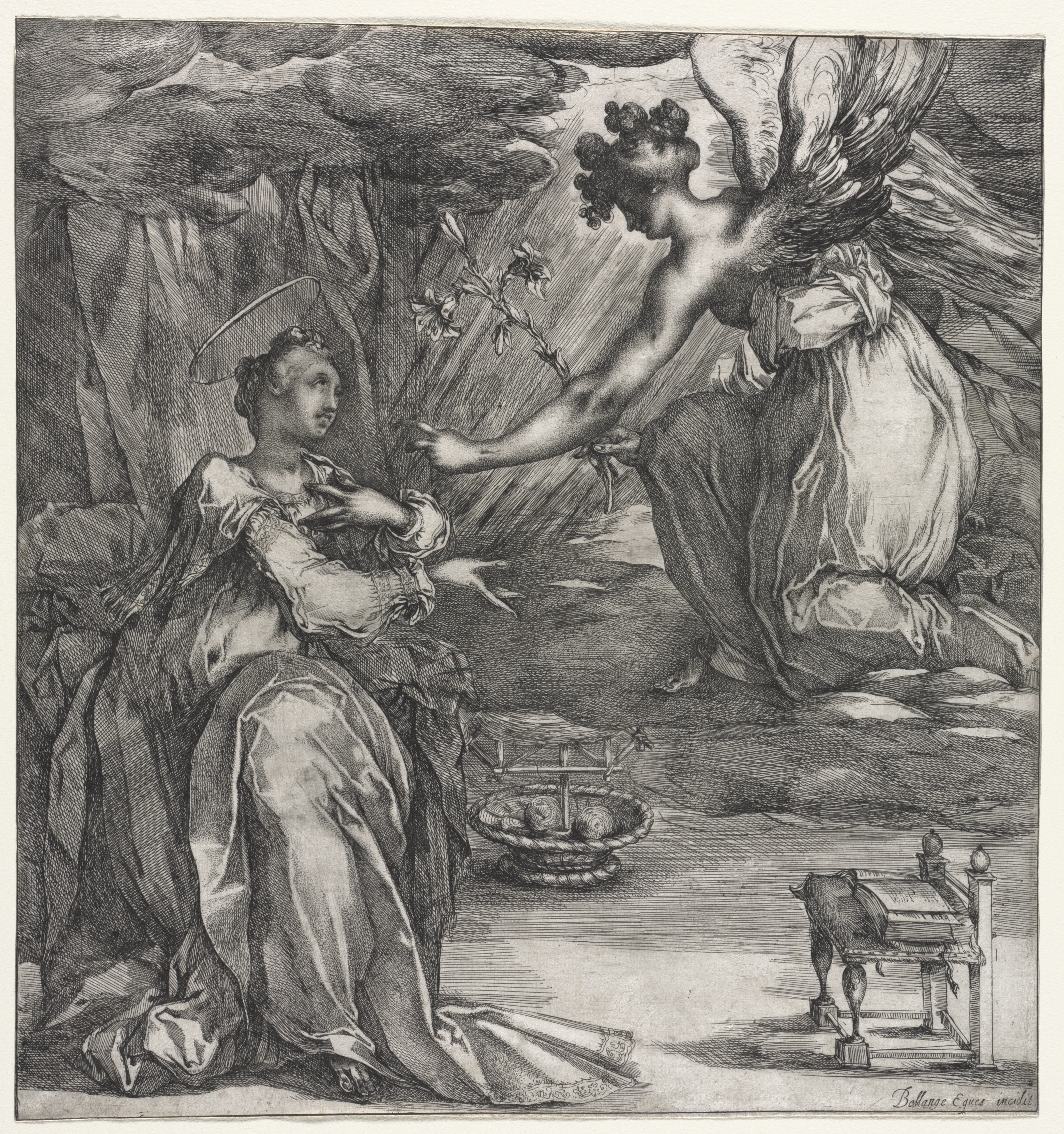 The Annunciation by Jacques Bellange: A black-and-white drawing depicting a scene with two main figures. The female figure on the left sits on a surface, wearing a long dress with puffy sleeves. Her hair is pulled back, and she has a semi-circle halo over her head. She looks to her right with her mouth open. Her left arm is bent at the elbow, hand positioned near her chest. Her right arm is bent at the elbow, hand resting on her lap. A basket with spherical objects sits between her legs. To her right, a winged nude male figure with short hair appears to be flying or jumping. He extends his right arm with three fingers pointed towards the female. His left arm is bent, and he holds fabric with his hand. The background contains abstract shapes resembling rocks and a cloudy sky. A table with a cow's head on it is on the bottom right. The image's color is entirely shades of gray.