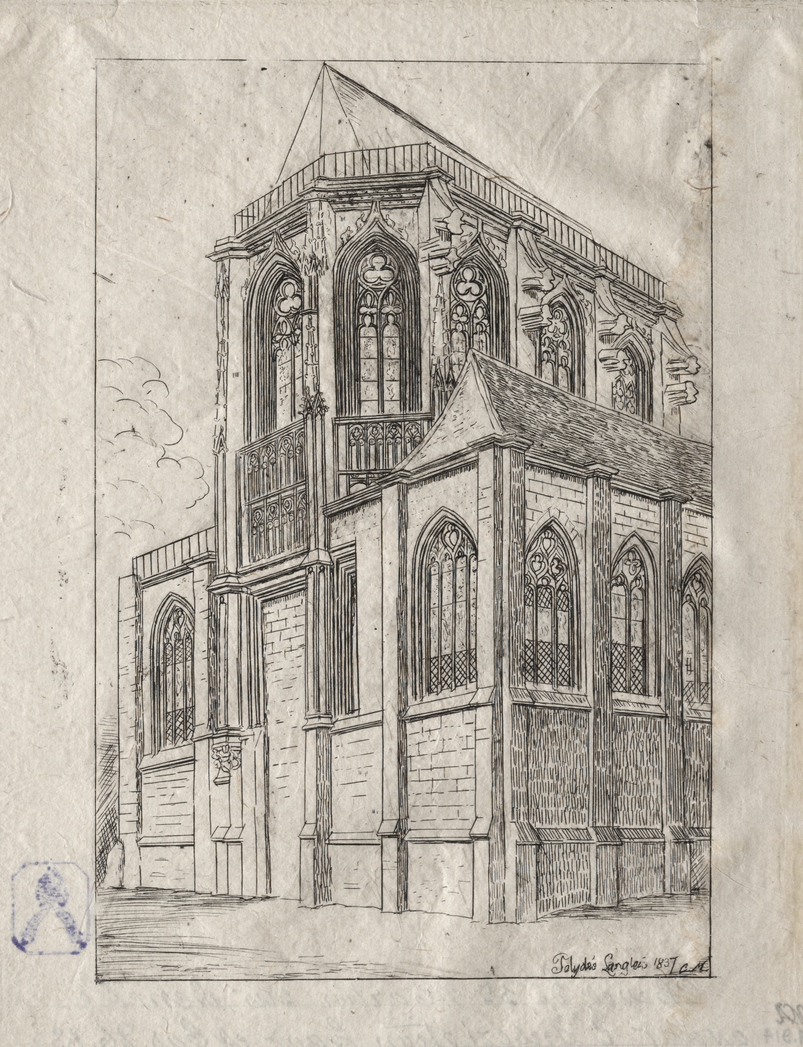 A church apse with a steeply pitched roof and a balcony; the apse has three large gothic-arch windows with stone ornamentation; below the windows is a row of buttresses; to the right are two rows of four smaller gothic-arch windows with stone ornamentation; to the left, a lower section of the church with one large gothic-arch window; cloudy sky on left; on a beige background.