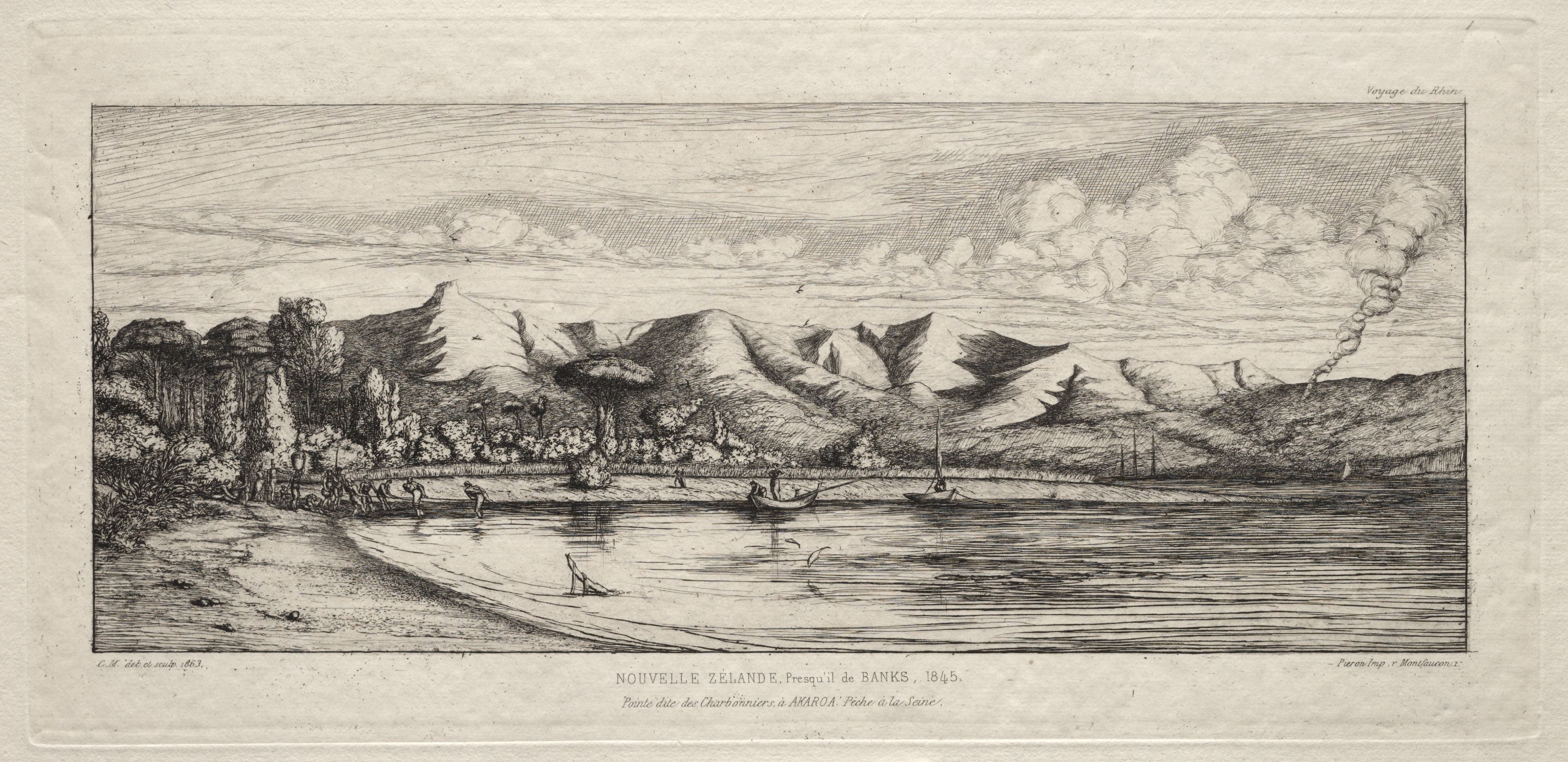 Black and white landscape drawing of a mountainous coastline. The drawing depicts a shoreline, with a beach on the left and a body of water on the right. People are in a canoe near the center and on the beach on the left, some holding long fishing rods. Trees line the beach on the left. Mountains line the background, with a cloudy sky. The mountains appear rugged and steep. The water reflects the sky's light. The drawing includes French text at the bottom and top right. The text at the bottom appears to read "Nouvelle Zelande, Presqu'ile de Banks, 1845" and additional smaller text. The image has an off-white border around it.