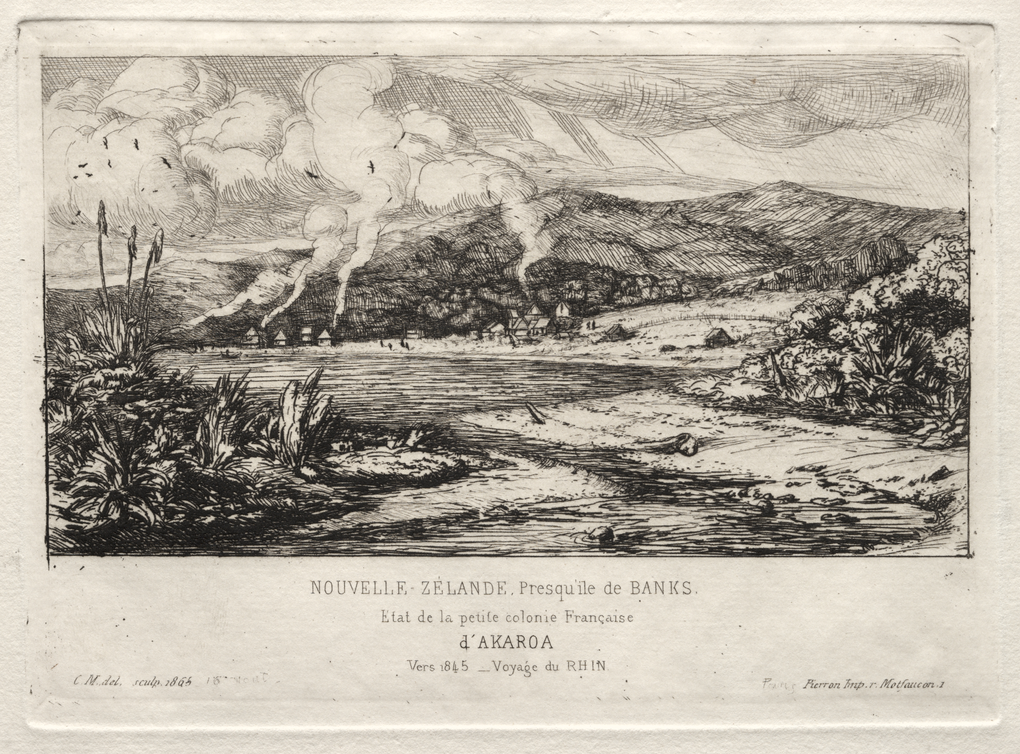 Black and white etching of a landscape. A body of water in the foreground with vegetation on either side. A dirt path leads down to the water. A few people on the far shore. Several buildings on the far shore emit smoke from their roofs. Mountains in the background under a cloudy sky with birds flying. Text below the image in French.