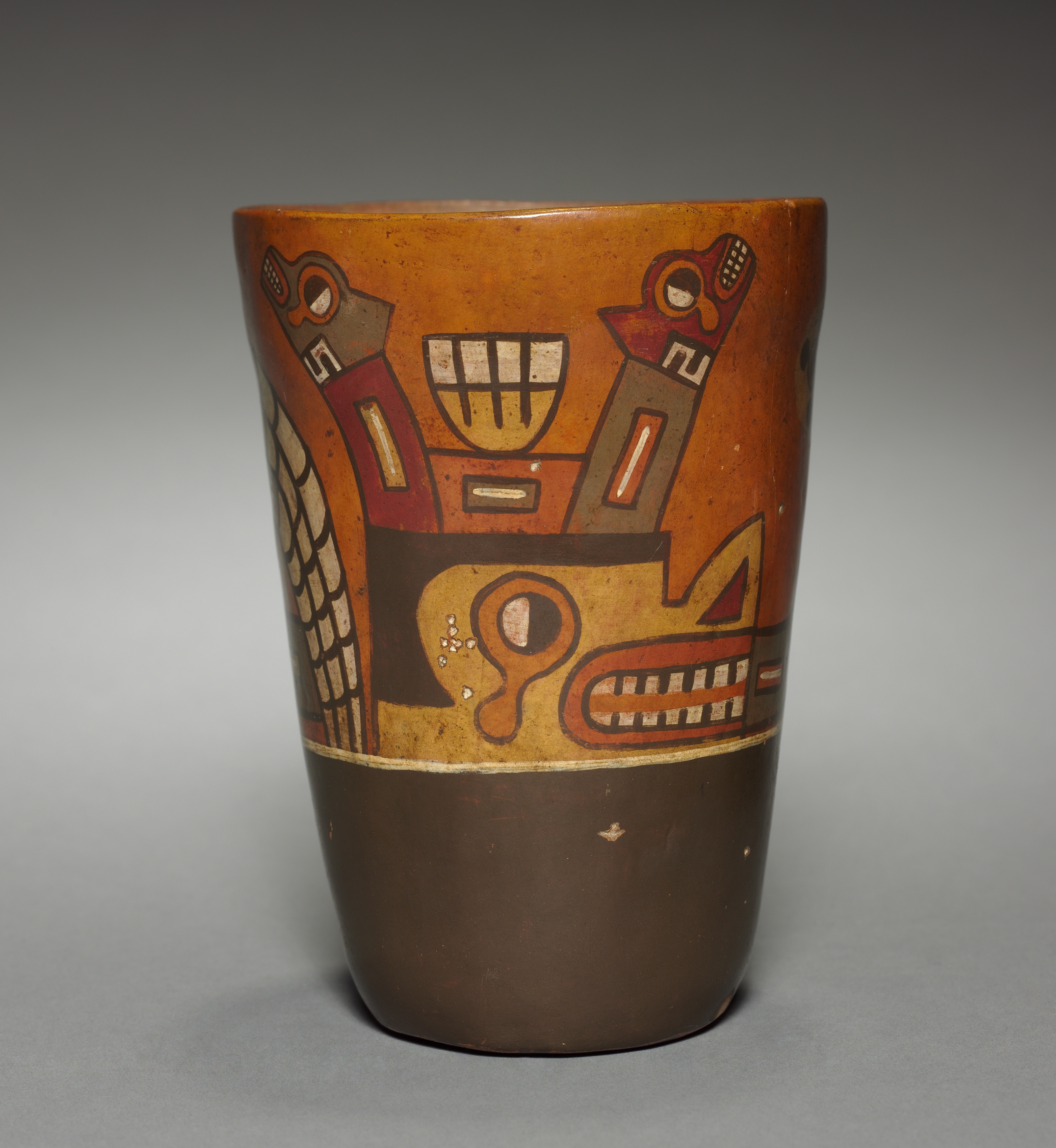 Brown ceramic vessel with a wide mouth and a narrow base. The top portion is burnt orange with geometric designs and figures in shades of red, beige, gray, and brown. A thick brown stripe encircles the lower third. The background is gray. Kero-shaped Vessel, modern version of a Wari-style vessel.