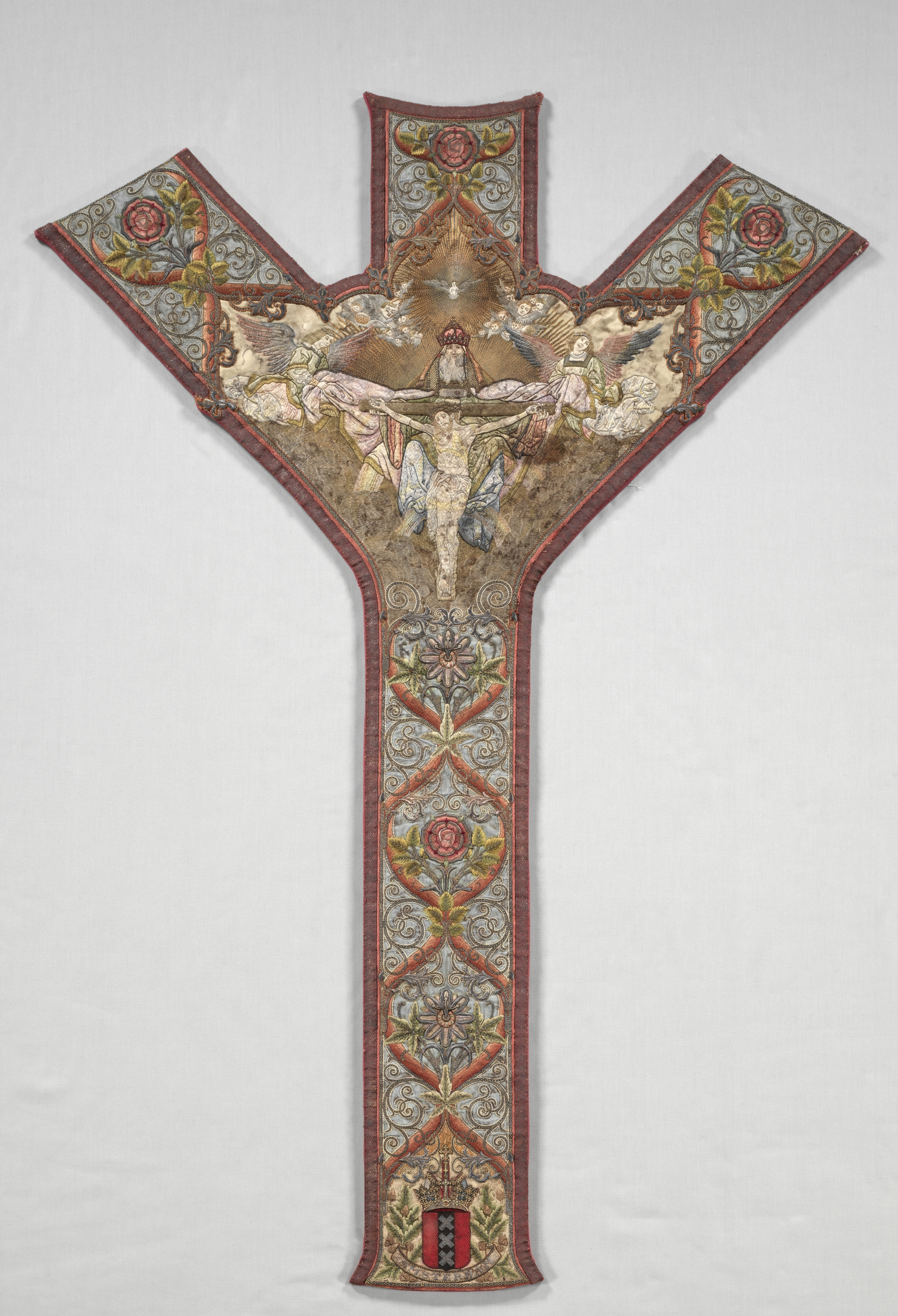 Orphrey Band by artist, depicts a T-shaped ornamental piece. The piece features a central image of Jesus Christ on the cross surrounded by angels. The central figure of Christ is in a gold-colored background. He has a red head covering, and his body is nude. Two angels to his sides. The top section, forming the cross's head, has a red border and is decorated with a design featuring red flowers on a grey background with gold accents. Two side sections extend from the top section, each also bordered in red and featuring the same floral design. The long vertical section, forming the cross's stem, has a red border and a repeating pattern of diamond shapes with red flowers. A crest or coat of arms is at the bottom featuring two tan animals on either side of a red and black shield. The background of the image the piece is displayed on is light grey.