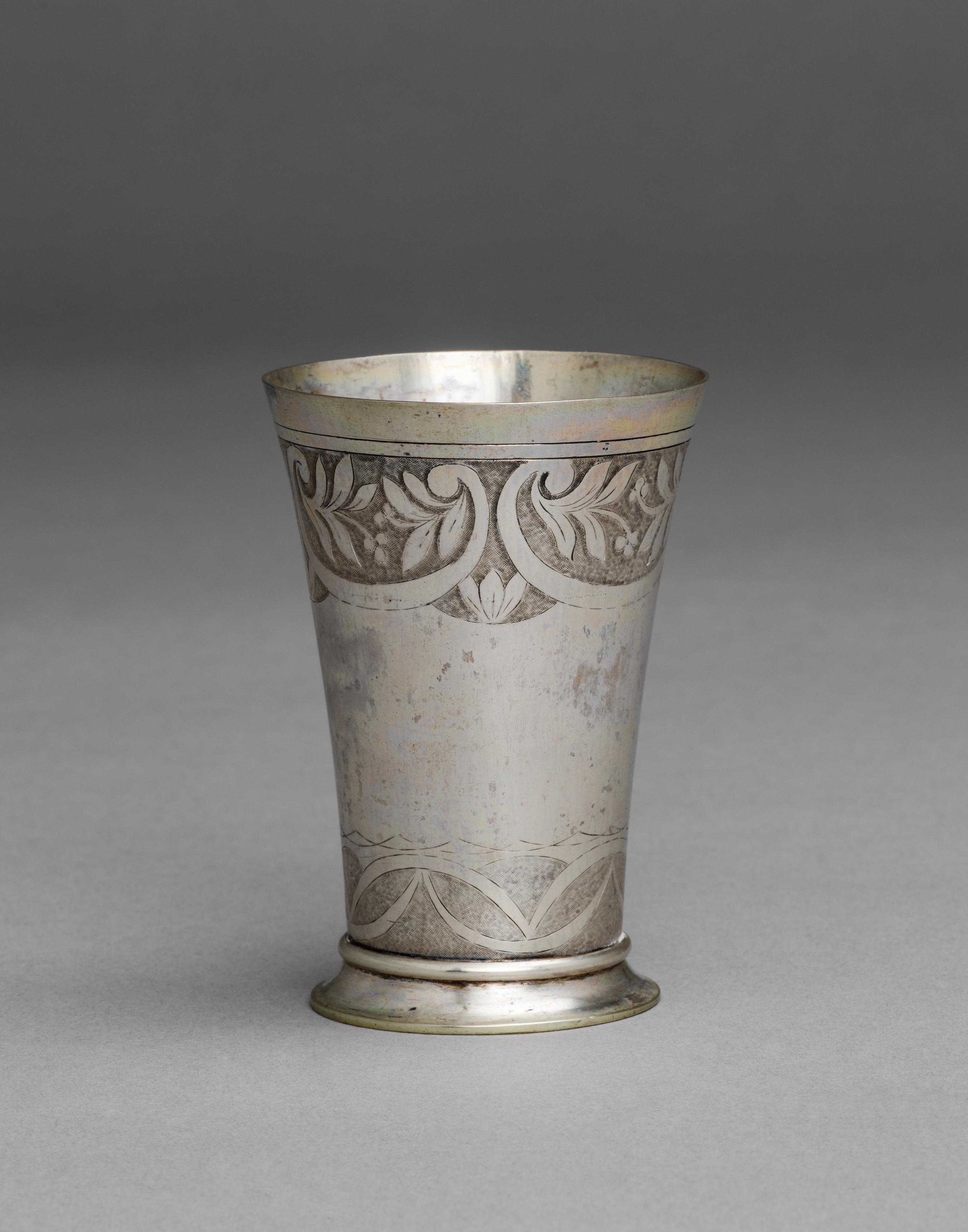 Silver beaker with a wide mouth tapering down to a small base. The beaker features an etched design around its top third, consisting of curved leaves resembling a floral pattern. A second etched design with a triangular motif is present around the lower third. The beaker shows signs of wear and tear, with a tarnished appearance. The background is gray with a lighter shade at the bottom and a darker shade at the top.