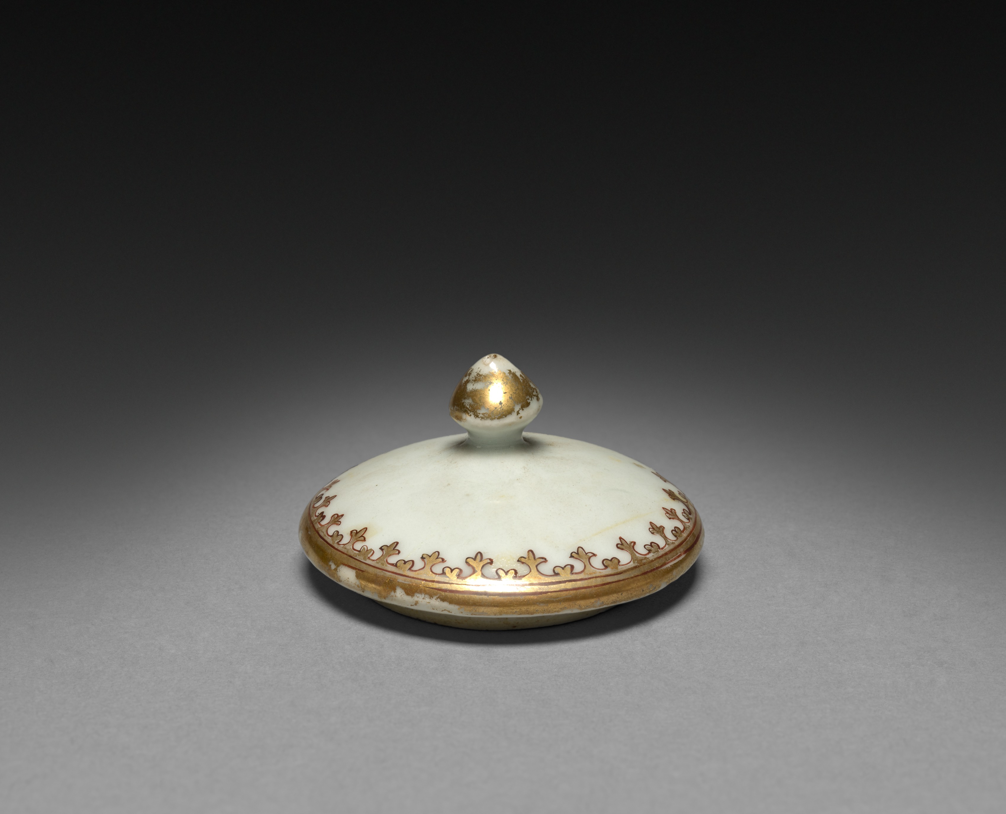 White ceramic milk jug cover with gold trim and a small, rounded finial on top. The cover is round and flat with a gold and brown decorative border around the edge. The finial is gold and white. The cover has some small chips and marks on the surface. The background is a gradient from black at the top to gray at the bottom. The image appears to be a product photo. The artist of this piece is uncertain, but the title is "Milk Jug Cover".