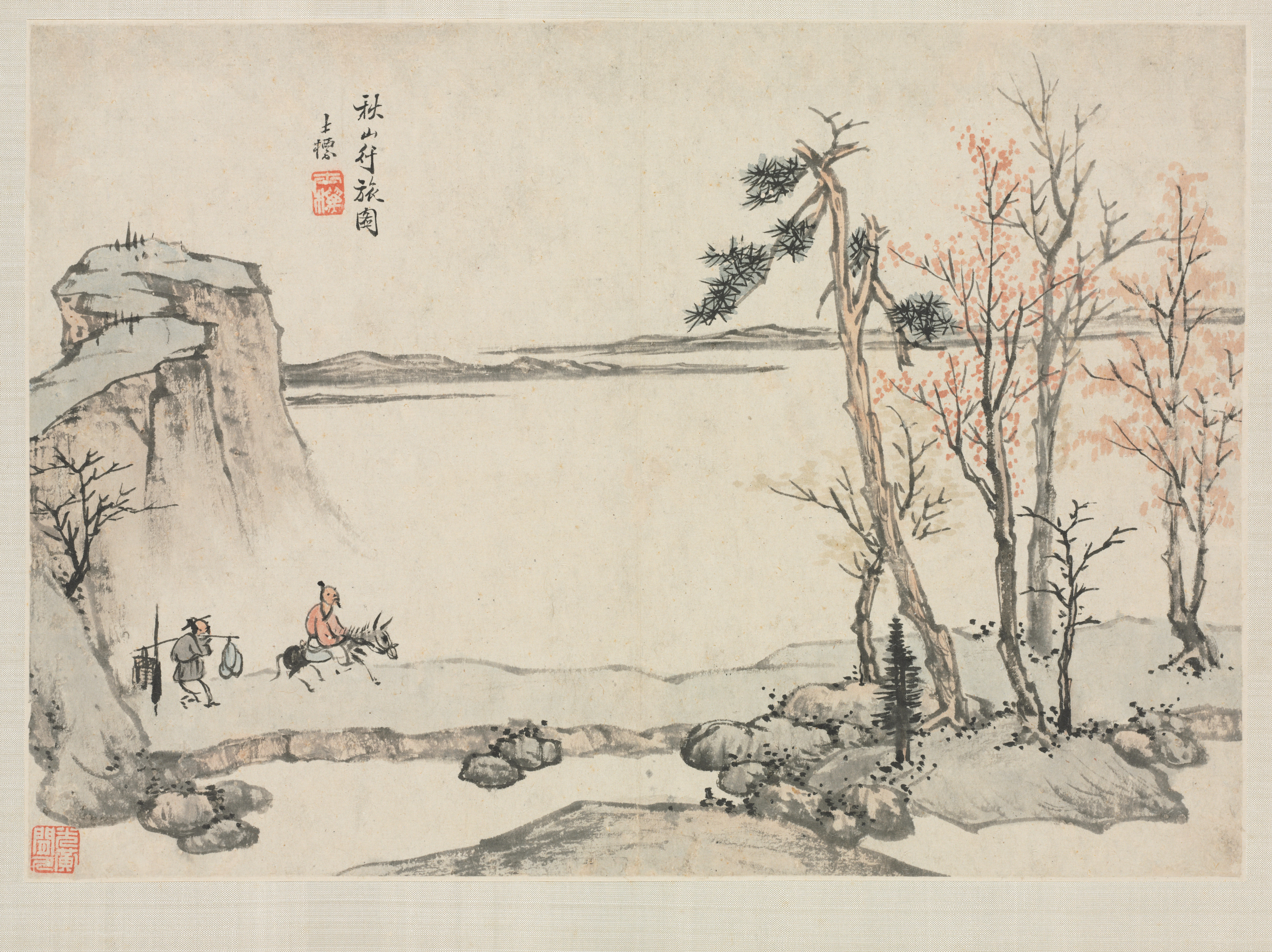 Landscape painting on beige background. A large cliff on the left. A body of water behind. A man on a donkey and another man walking on a path in front of the cliff. Trees on the right; some with orange leaves. Rocks on the foreground. Chinese characters and red seals.