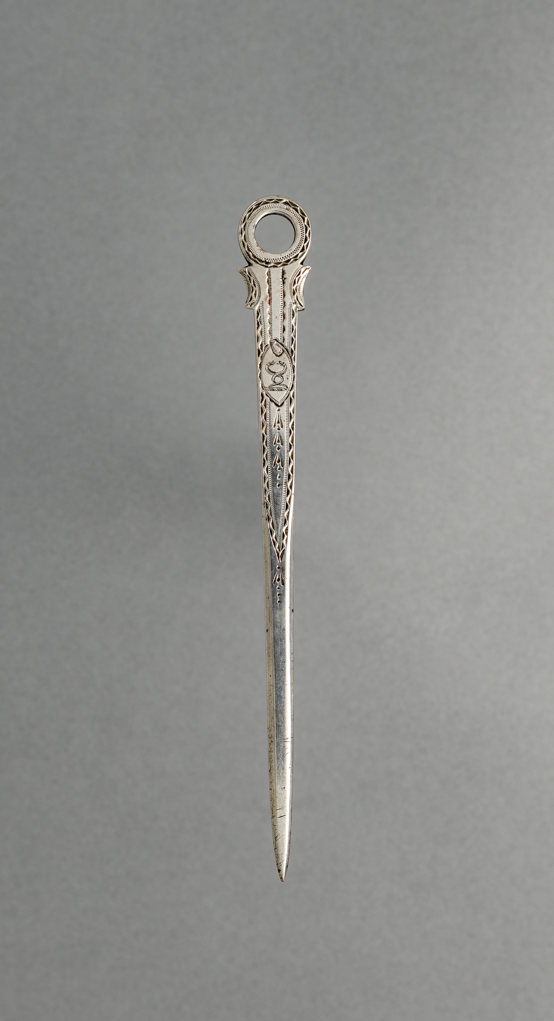 A long and thin metal skewer with a pointed bottom. The handle of the skewer is decorated with lines and scrollwork. The top of the handle is a circle. The background is gray. The skewer is by John Power.
