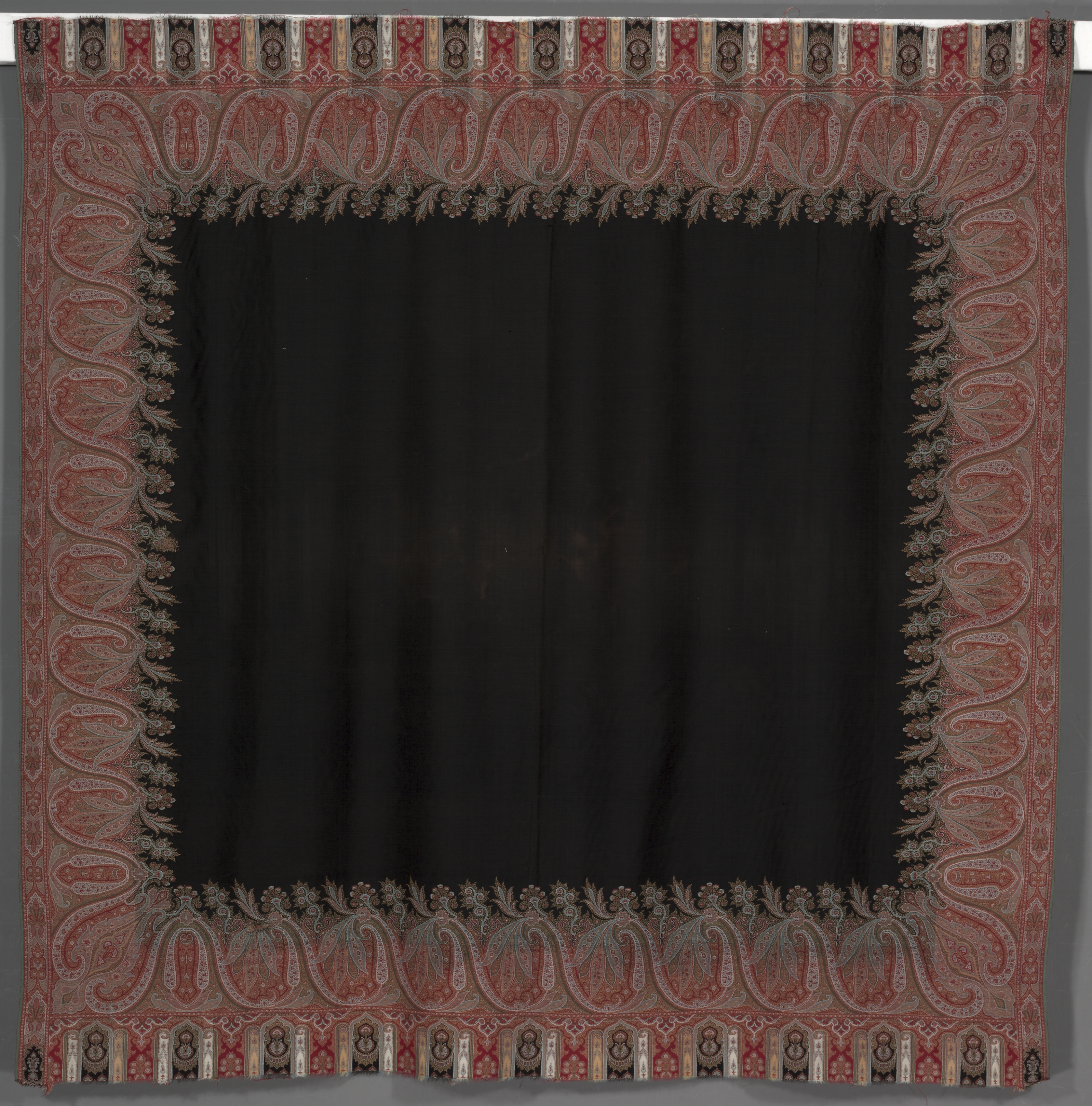 The Square Shawl by an unknown artist is a square textile with a black center and a decorative border. The border is red, brown, and gray with a paisley pattern. The border has a repeating design with teardrop shapes and leaves. The design on the border is intricate with small details and shapes. The center of the shawl is solid black with some wrinkles. The shawl appears to be made of a smooth material. The background of the image is gray.