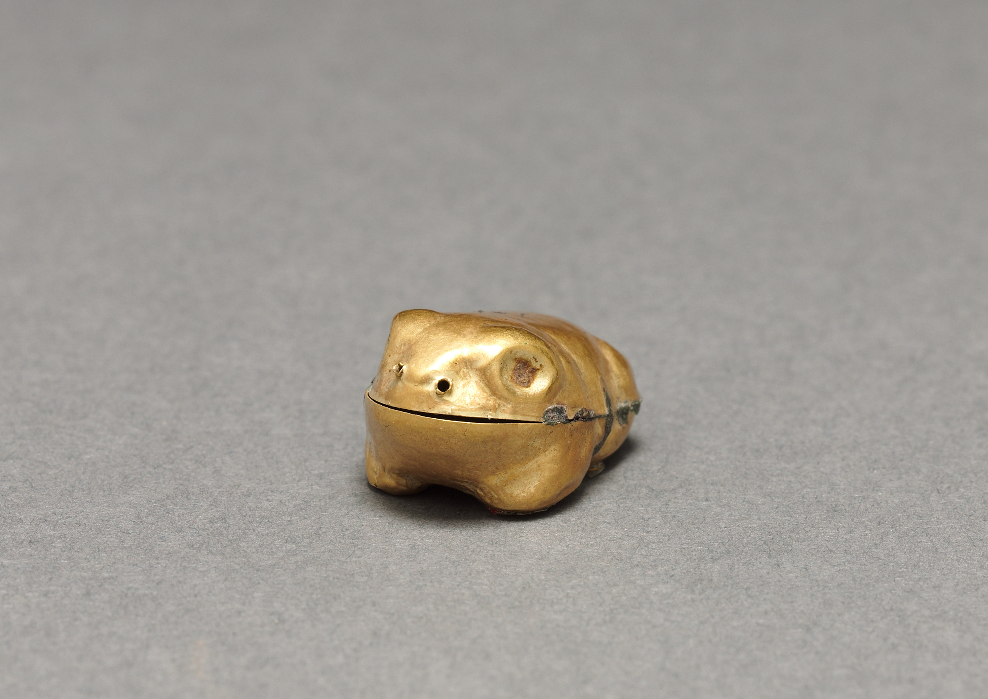 Small golden frog pendant with lid. The frog is sitting on its haunches. Two small legs are visible to the side. The frog has a smooth body. Two small circular eyes. A thin line encircles the middle. A small hole on the left side of the frog's head. The background is gray.