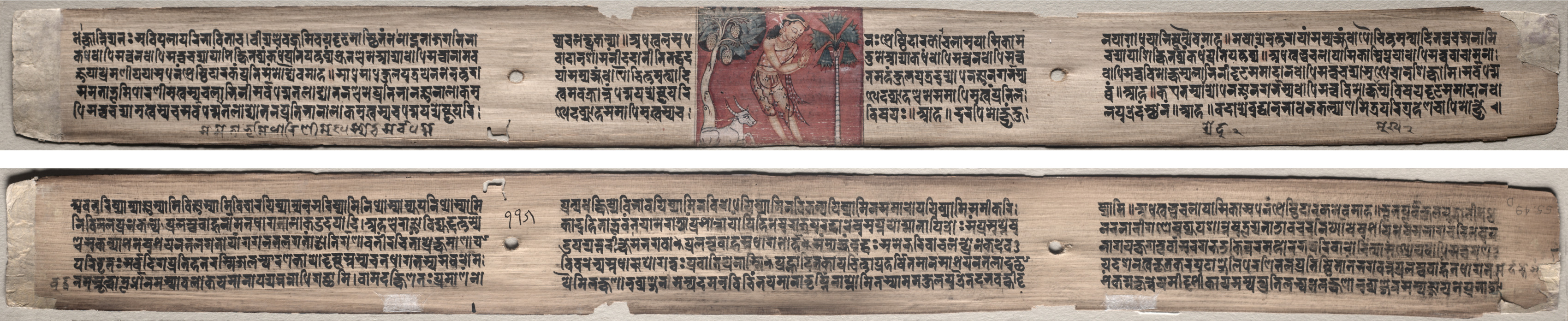 Two long, narrow, rectangular pieces of aged, light-brown material with rounded edges, likely palm leaves or paper, are shown side by side on a beige surface. The upper piece features black writing in a foreign script on the left and right thirds, with a central square illustration. The illustration depicts a dark-haired, light-skinned man in a pink garment with a green sash. He holds a stem with green leaves in his right hand and grasps the horn of a large brown buffalo with his left hand. The buffalo's head protrudes from the right edge of the illustration. Four holes are punched along the center of each piece, and the lower piece has black writing covering its surface.