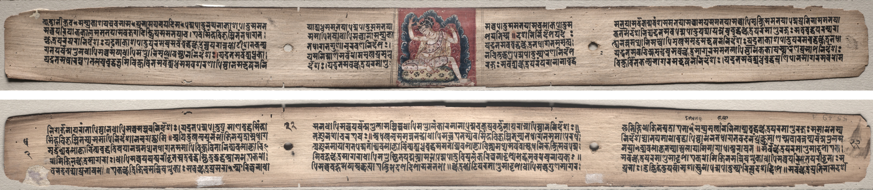Two long, narrow, aged, light-brown pages with rounded edges side by side. The top page has a central square image; a figure with long black hair and a white and gold garment sits cross-legged on a red background with a green and blue border, surrounded by black text on either side, and additional text above and below the figure. The bottom page has black text covering most of the surface, with small holes and worn spots. The pages appear to have a central crease and are against a light-gray background.